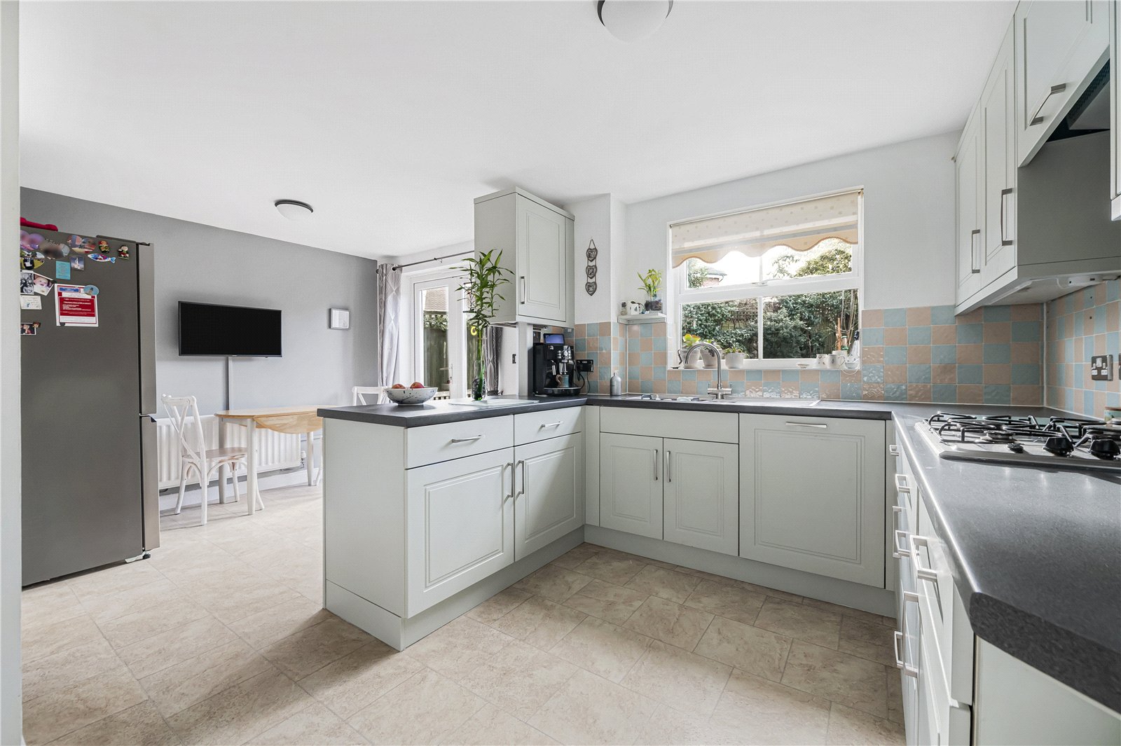 Kitchen area : Well fitted with an attractive range of matching wall and base units in a Shaker style finish incorporating built-in dishwasher and drawers. Matching wall cupboards, tall oven housing with Bosch double oven and grill, peninsular unit with storage and work top and part tile d walls. Range of worktops with 1 and ½ bowl sink unit with 4 ring gas hob with cooker hood over. Tile effect flooring, outlook to garden and open through to: