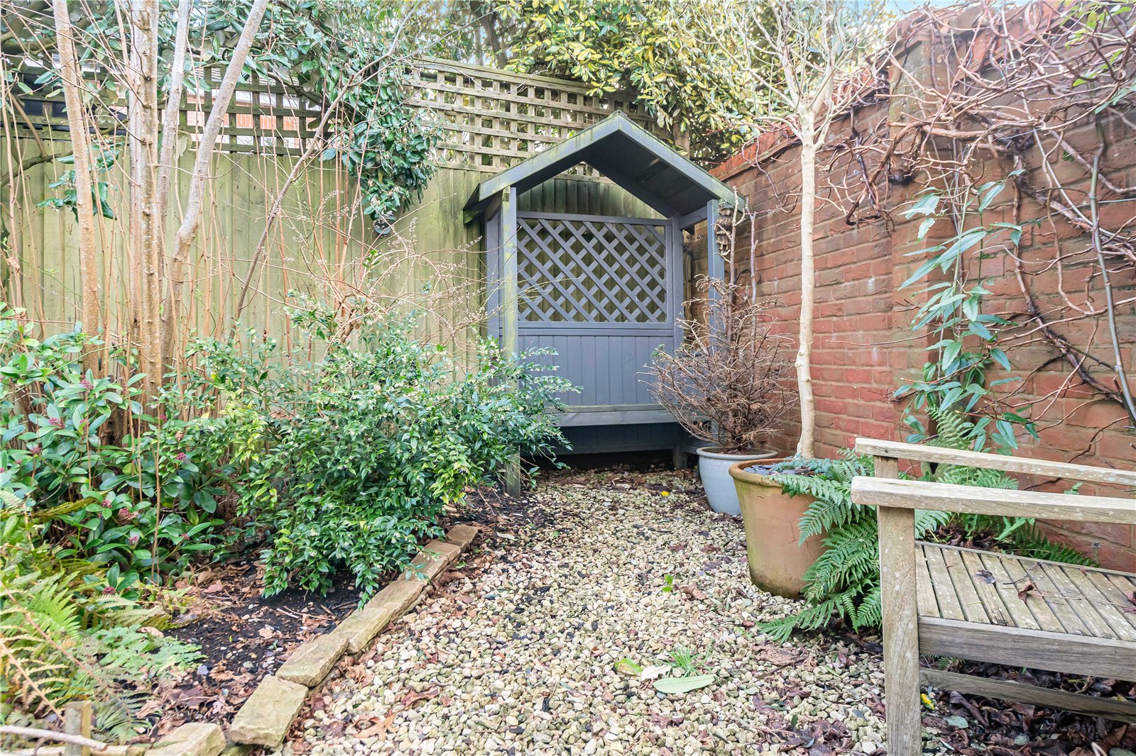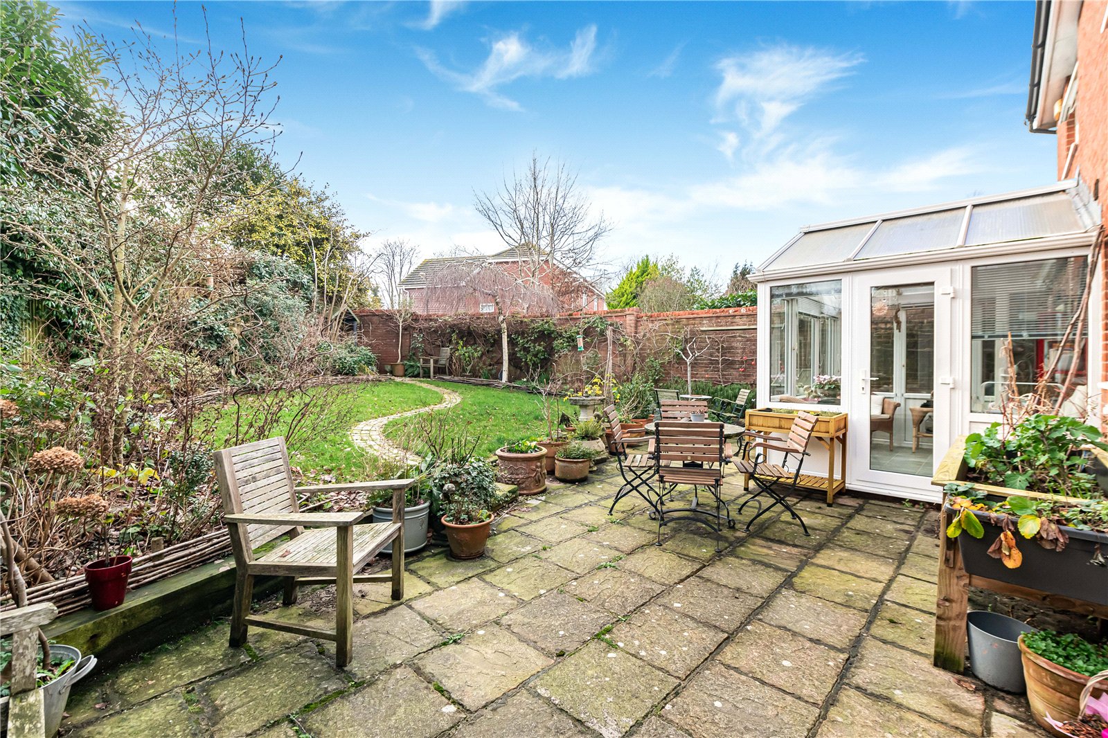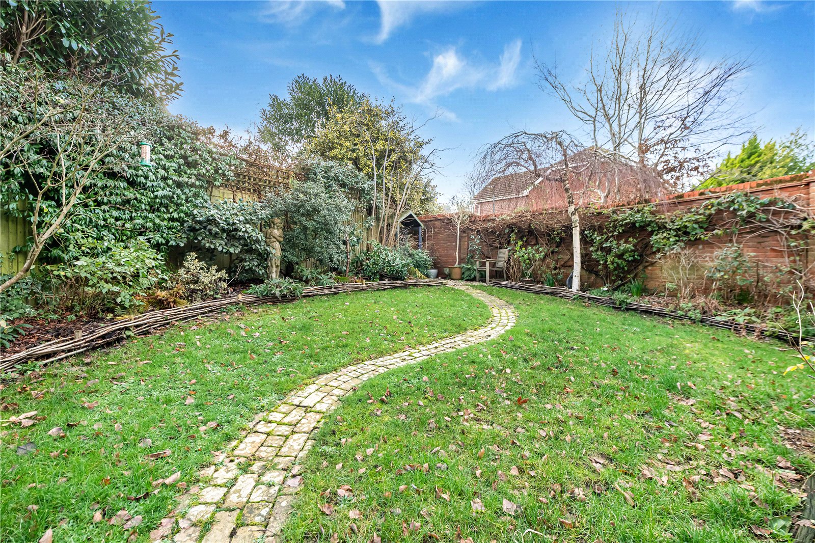 Garden : The property sits on a corner plot and is well screened at the rear by a brick wall and fencing for a high degree of privacy. There is a wide paved sun terrace with allow border with a step leading up to a formal shaped lawn boasting deep, well stocked flower beds. There is a side gate and a delightful South and West aspect.