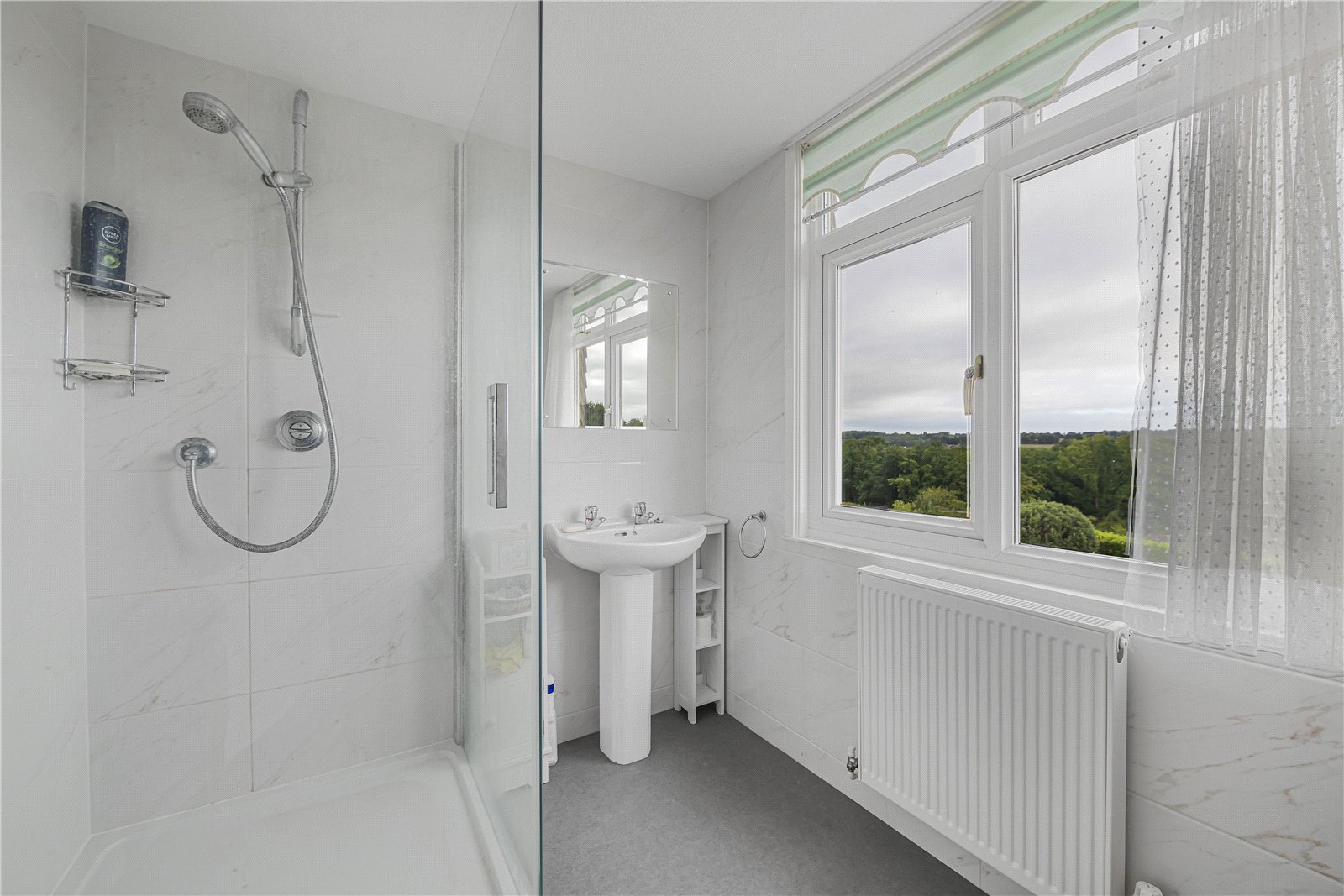 Bathroom : Comprising bath with mixer tap, shower enclosure, WC with concealed cistern and vanity units with wash hand basin. Wide display top, tiled walls and floor and radiator.