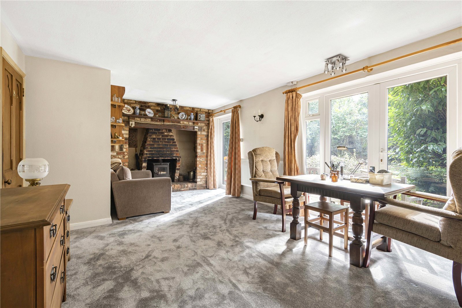 Sitting Room : Character room with attractive wide brick inglenook style fireplace with brick canopy, brick surround and wood burning stove. Wall and ceiling light points, radiator and double doors to the large secluded garden.