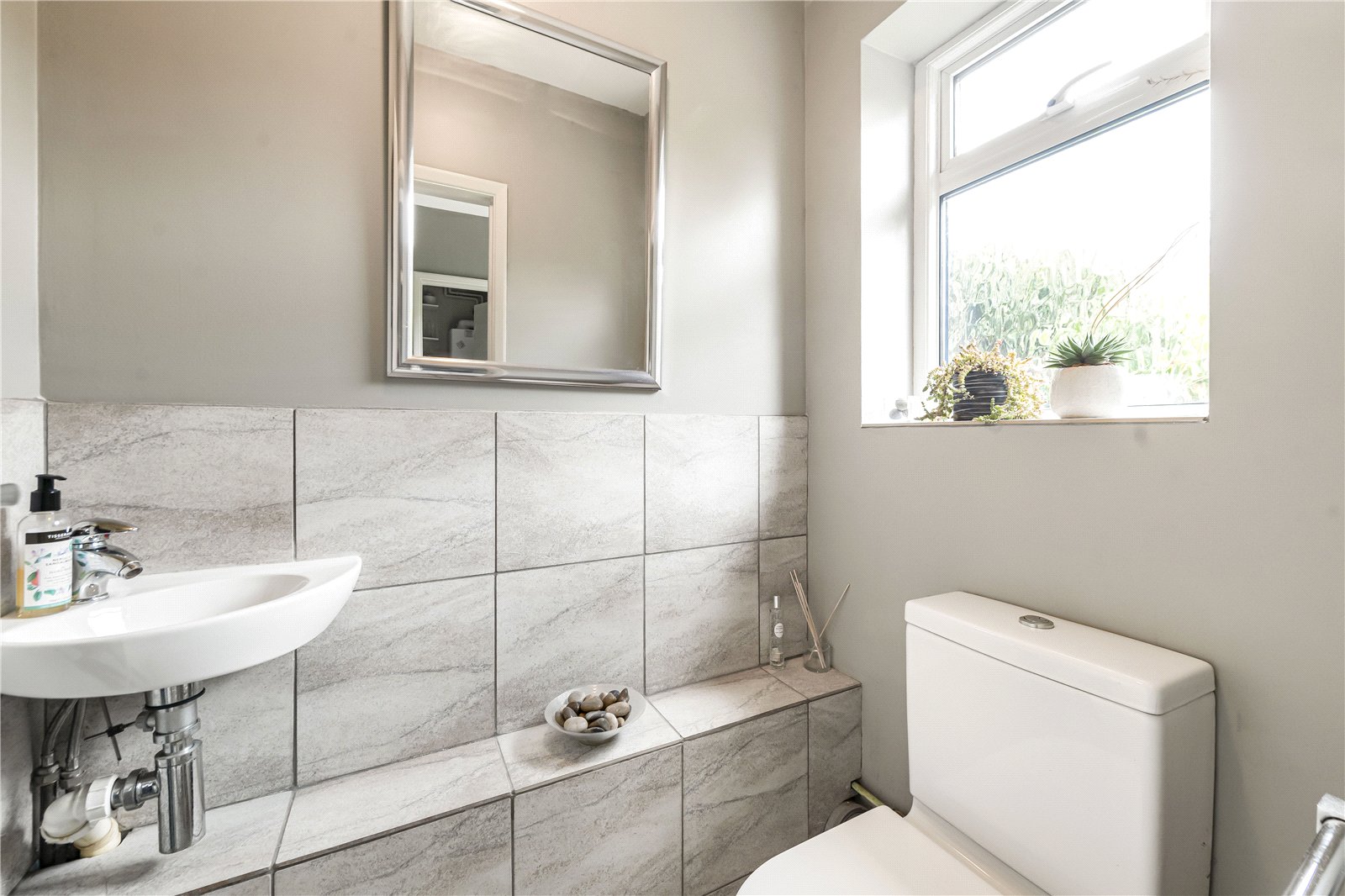 Cloakroom : Comprising WC and wash hand basin. Tiled floor.