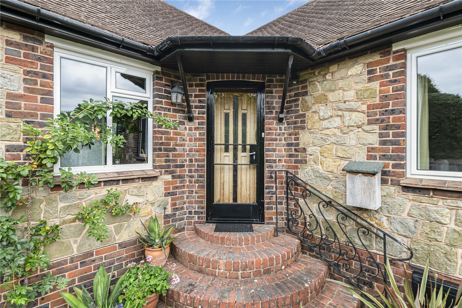 From the garage 2 steps lead to a pathway which splits with a flight of semi-circular brick steps approaching the oak front door and a further path leading to the rear and side access.