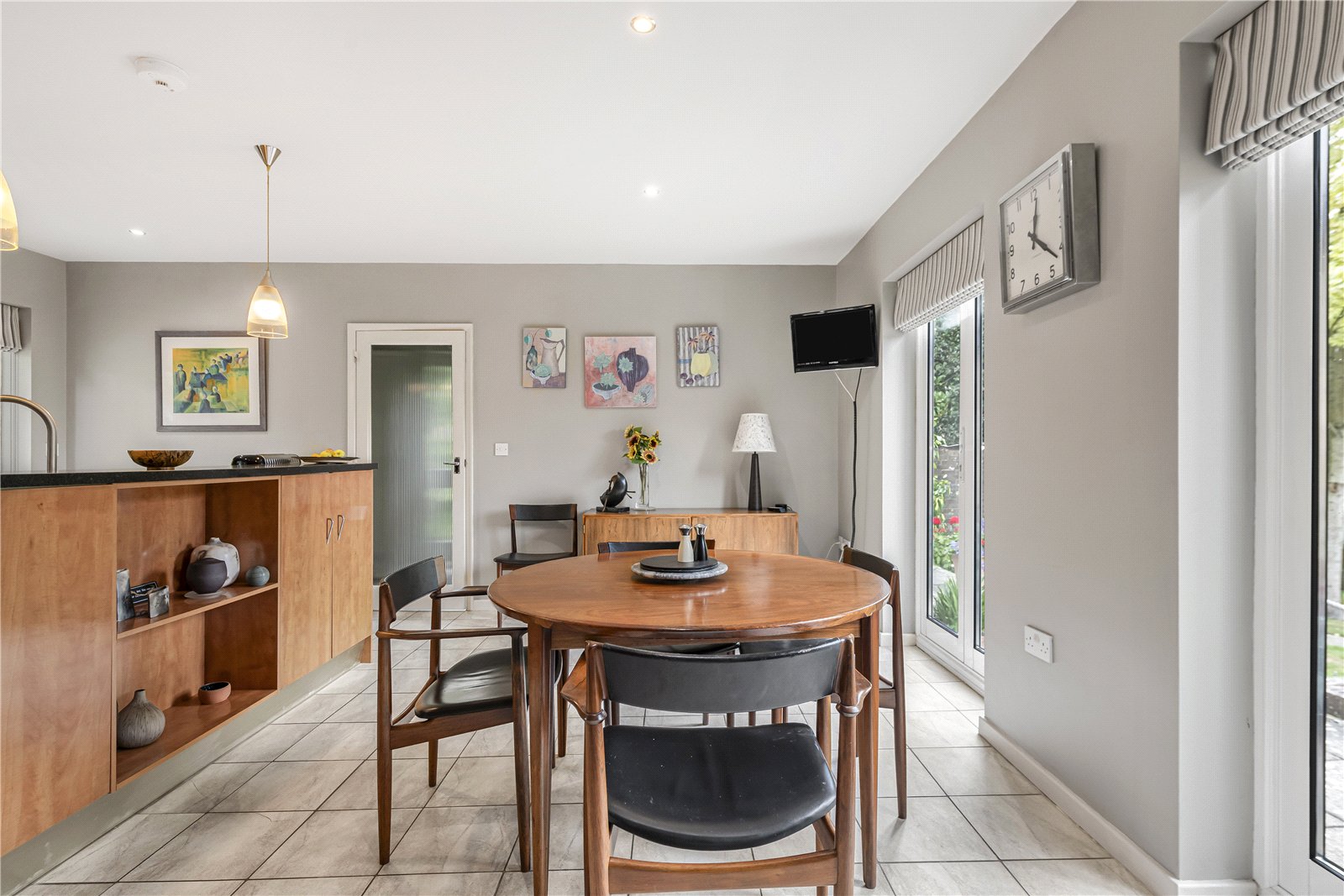 worktops with island unit with storage and stainless steel 2 bowl sink with raised shelf ledge. Radiator, double doors to garden and rear terrace, tiled floor, wall television point, light points and ample space for dining suite. Lovely outlook to the landscaped garden.