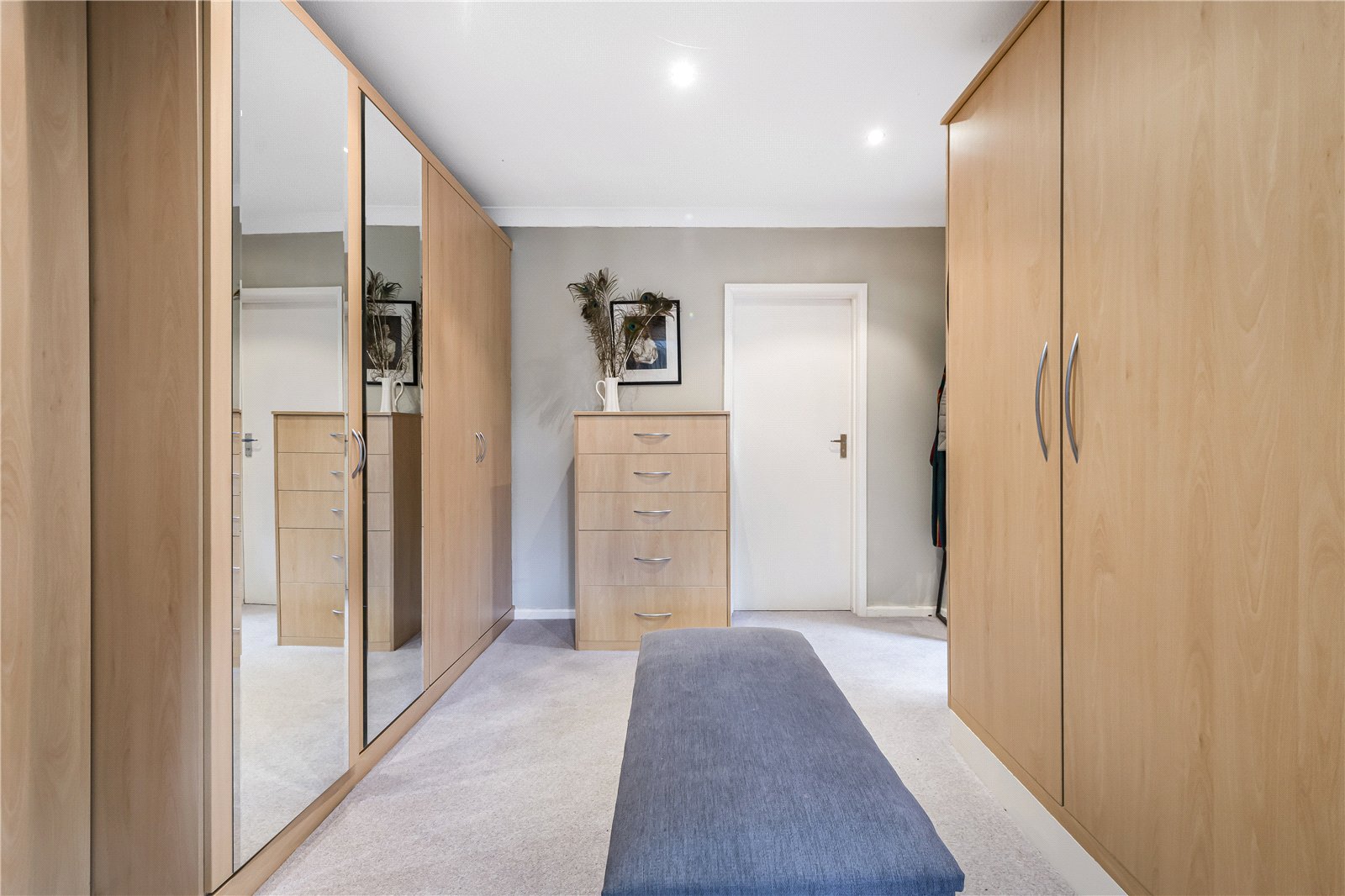 Dressing Room : large, well planned dressing room featuring a range of built in wardrobes with shelves, rails, shoe racks and drawers. Open through to