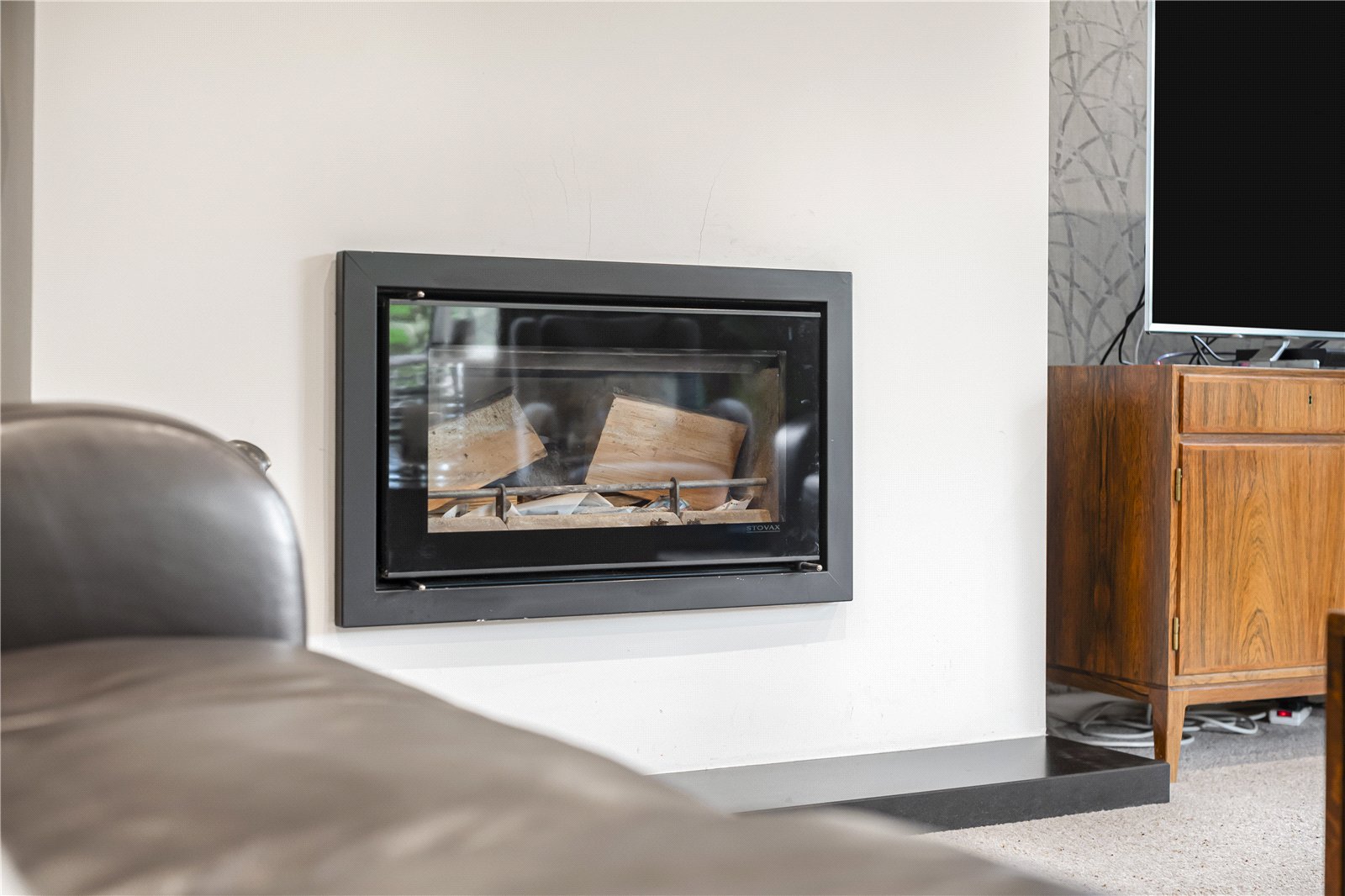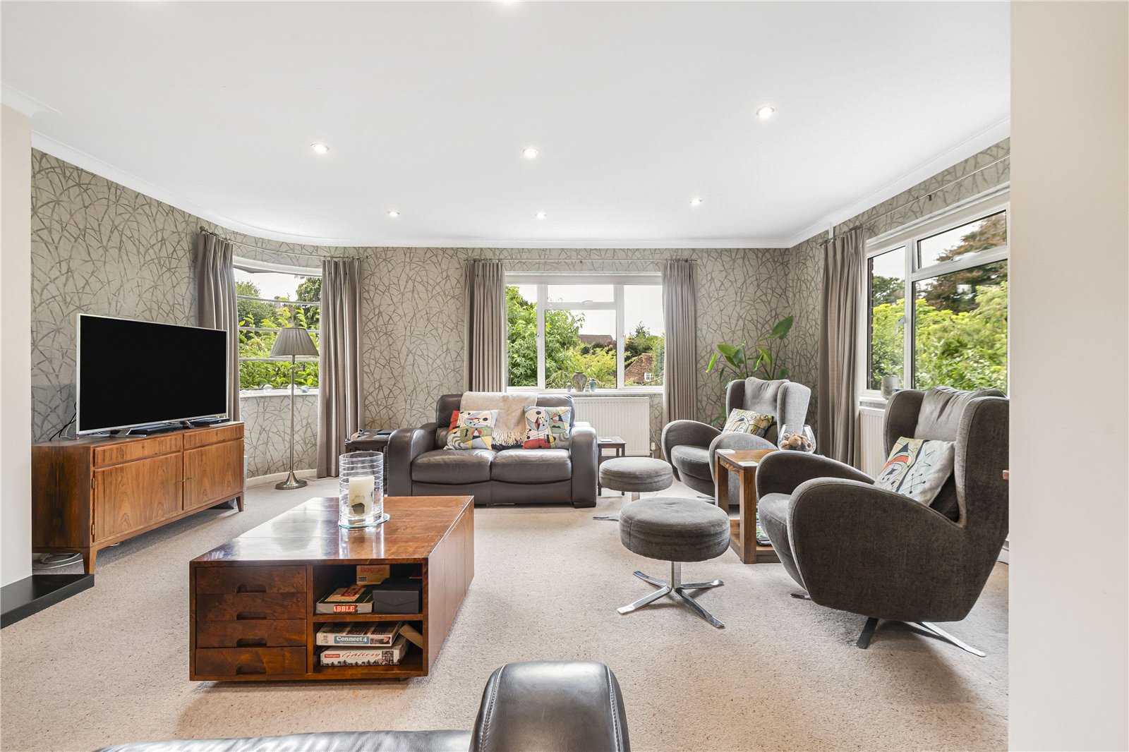 Sitting Room : Delightful reception area with modern cassette log burner and a striking curved corner window. 2 radiators, space for bookshelves, feature decorative wall paper, television point, down lights and dual aspect.