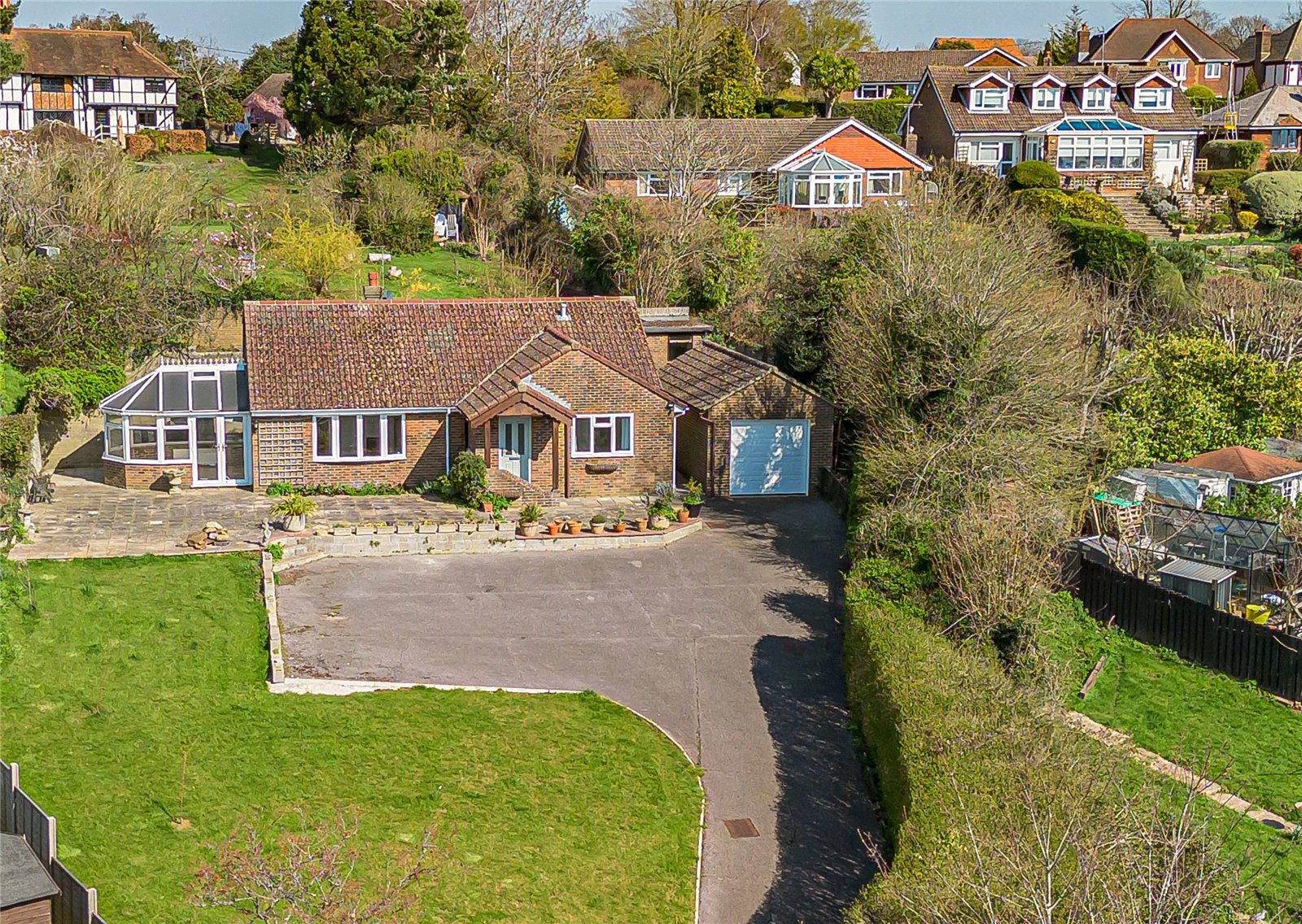 A very special opportunity : a detached, updated bungalow in a prime, elevated location up its own private drive with wonderful, far reaching views to the South Downs. Central village location with good access to a wide range of amenities, shops, bus routes, mainline station and country walks.