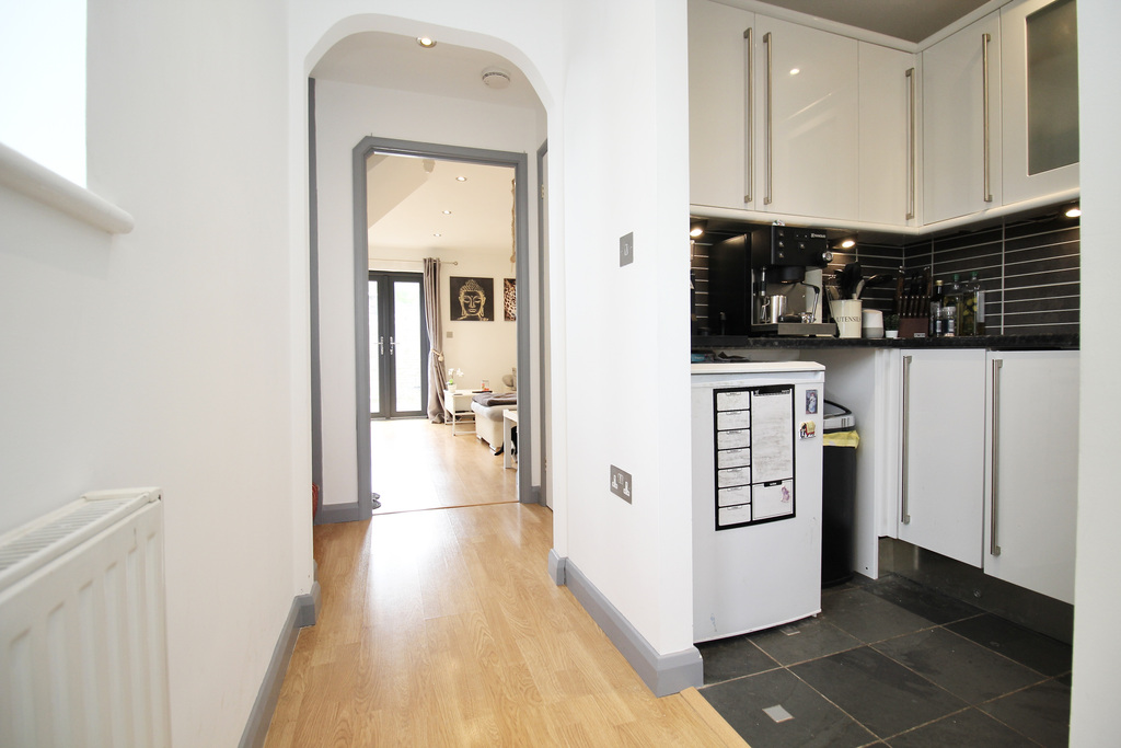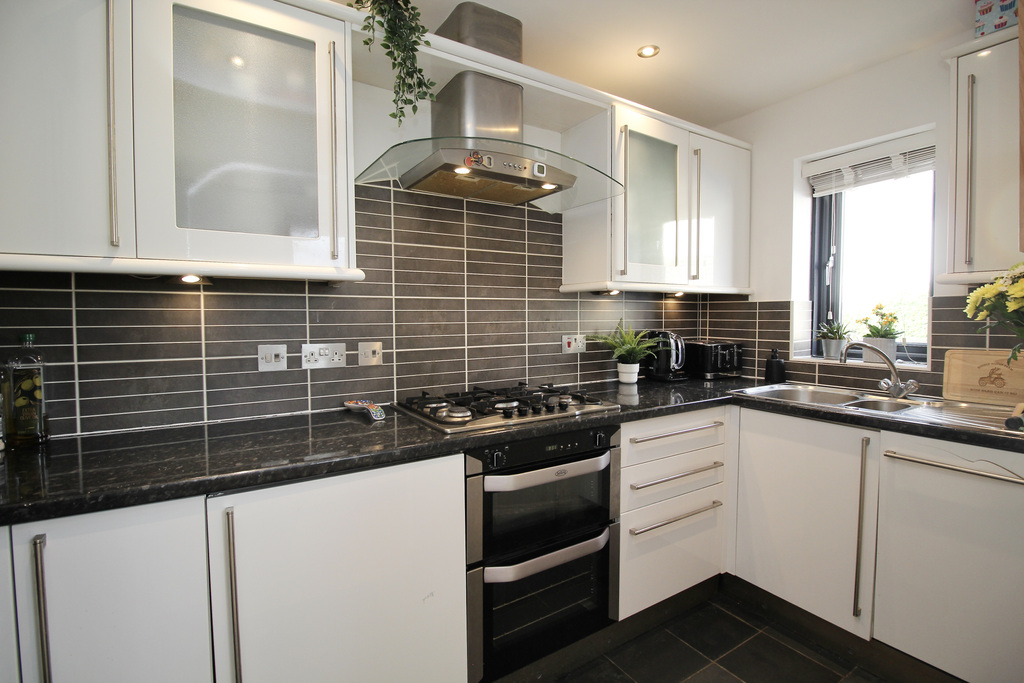 - Stylish, modern kitchen fitted with built-in oven and hob, integrated dishwasher, sleek wall, base and drawer units and space for freestanding appliances.
