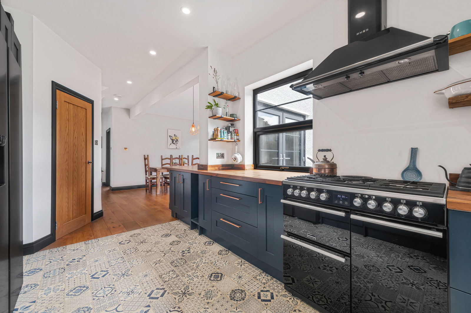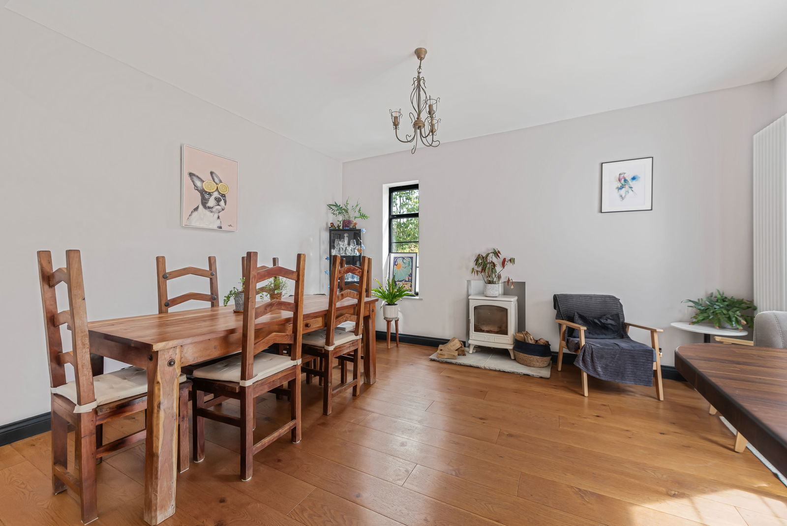 The home is tastefully decorated throughout and features a bright open-plan kitchen and dining area, complete with a sleek, modern kitchen—ideal for both everyday living and entertaining guests. A welcoming lounge, enhanced by one of two cosy woodburning stoves, provides a perfect retreat, while the convenience of a downstairs cloakroom adds to the home’s practicality.