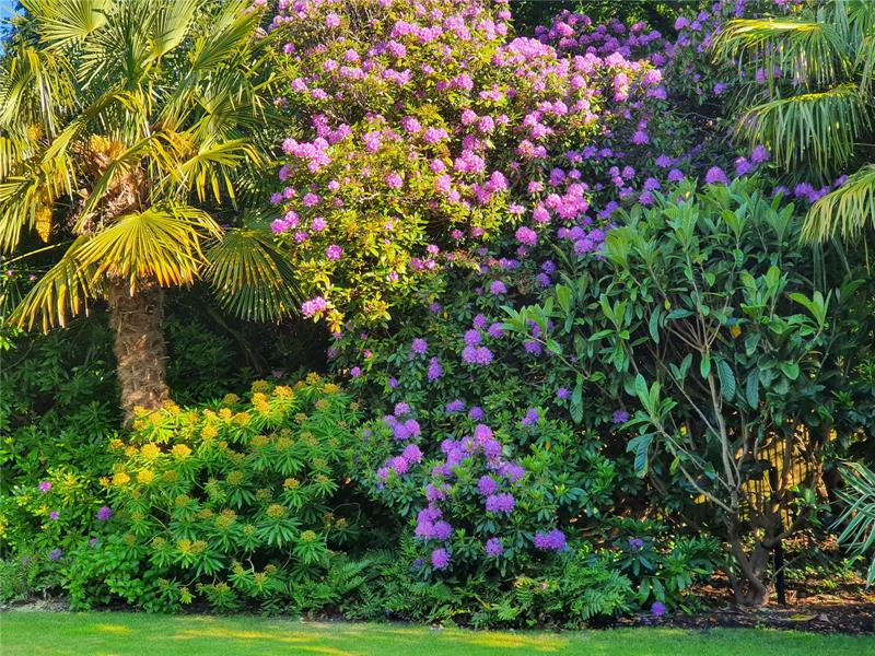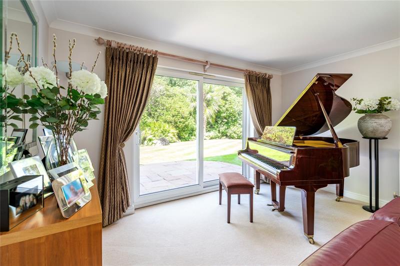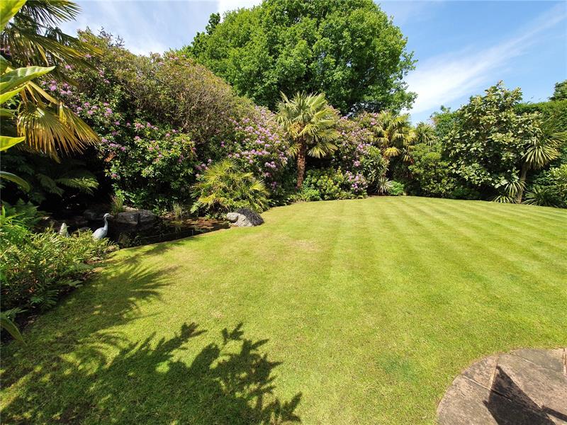 Stepping outside, the meticulously landscaped gardens surround the home, offering a picturesque backdrop for outdoor activities and relaxation. The garden has been designed with a tropical theme, featuring exotic shrubs, mature palm trees and an abundance of specimen trees, all adding to the seclusion of this peaceful garden.