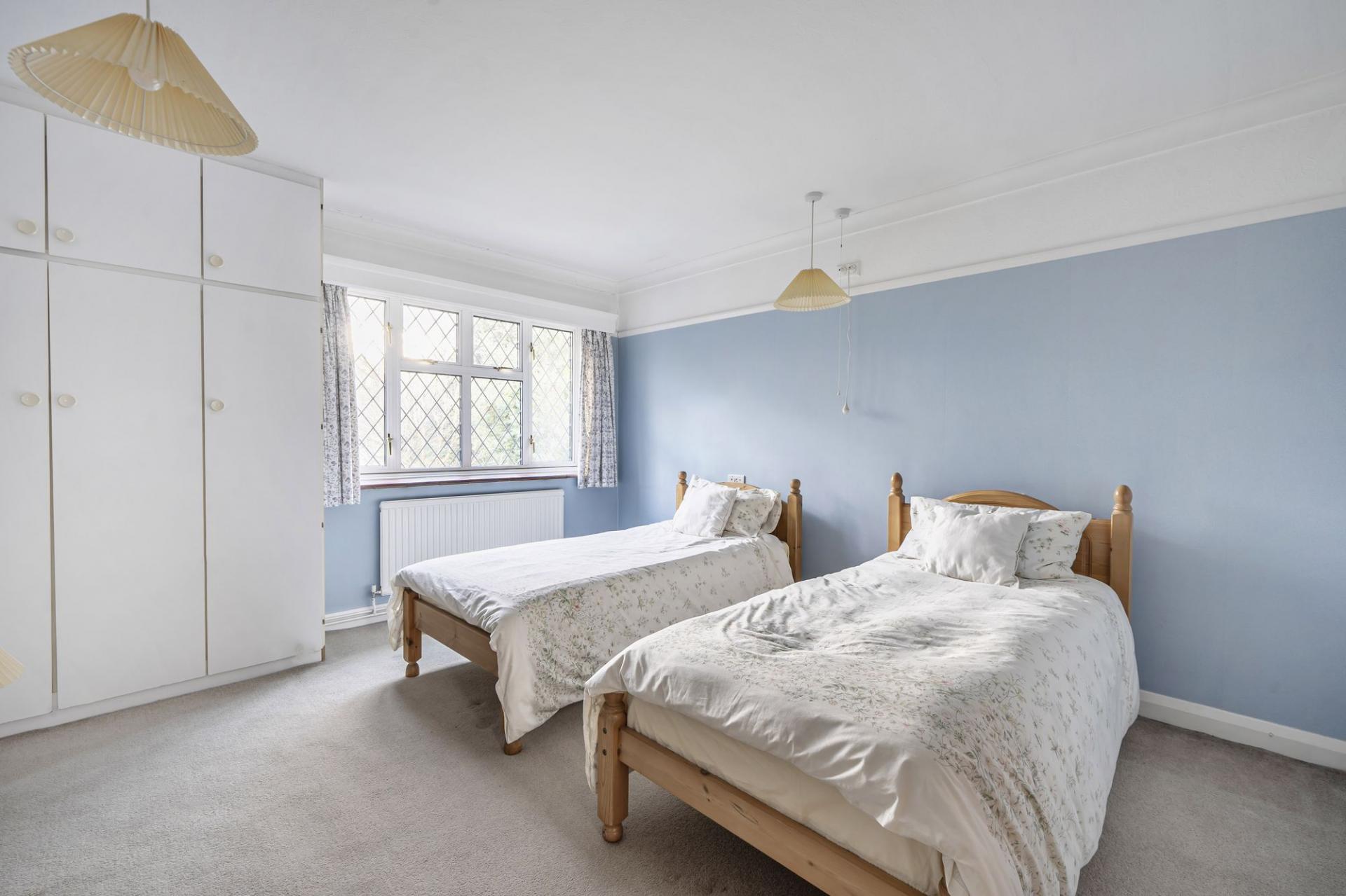 Stairs rise to the first floor where there are four generous bedrooms, each offering comfortable proportions and pleasant outlooks, together with two family bathrooms, providing excellent flexibility for a growing family or visiting guests. The layout lends itself well to future updating, with potential to create an impressive main suite or to reconfigure to suit individual requirements.