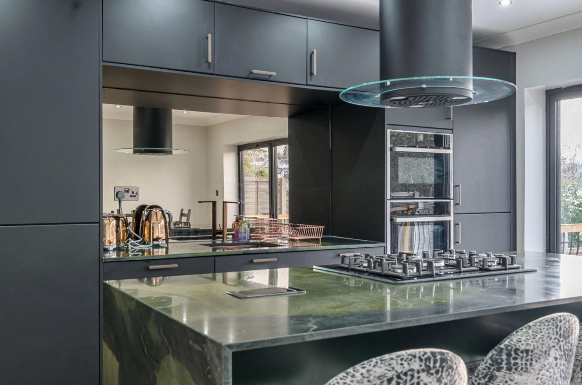 Double opening doors lead through to the stunning kitchen/family room, undoubtedly the heart of the home. This superb space has been fitted with a comprehensive range of stylish units and incorporates a central island, creating a sociable focal point for family life and entertaining alike. Integrated appliances include a dishwasher and fridge/freezer, together with a five-ring gas hob with stainless steel chimney-style extractor over, plus a built-in Neff oven and microwave. Bi-fold doors open directly onto the rear garden, allowing natural light to flood the room and creating a seamless connection between inside and out.