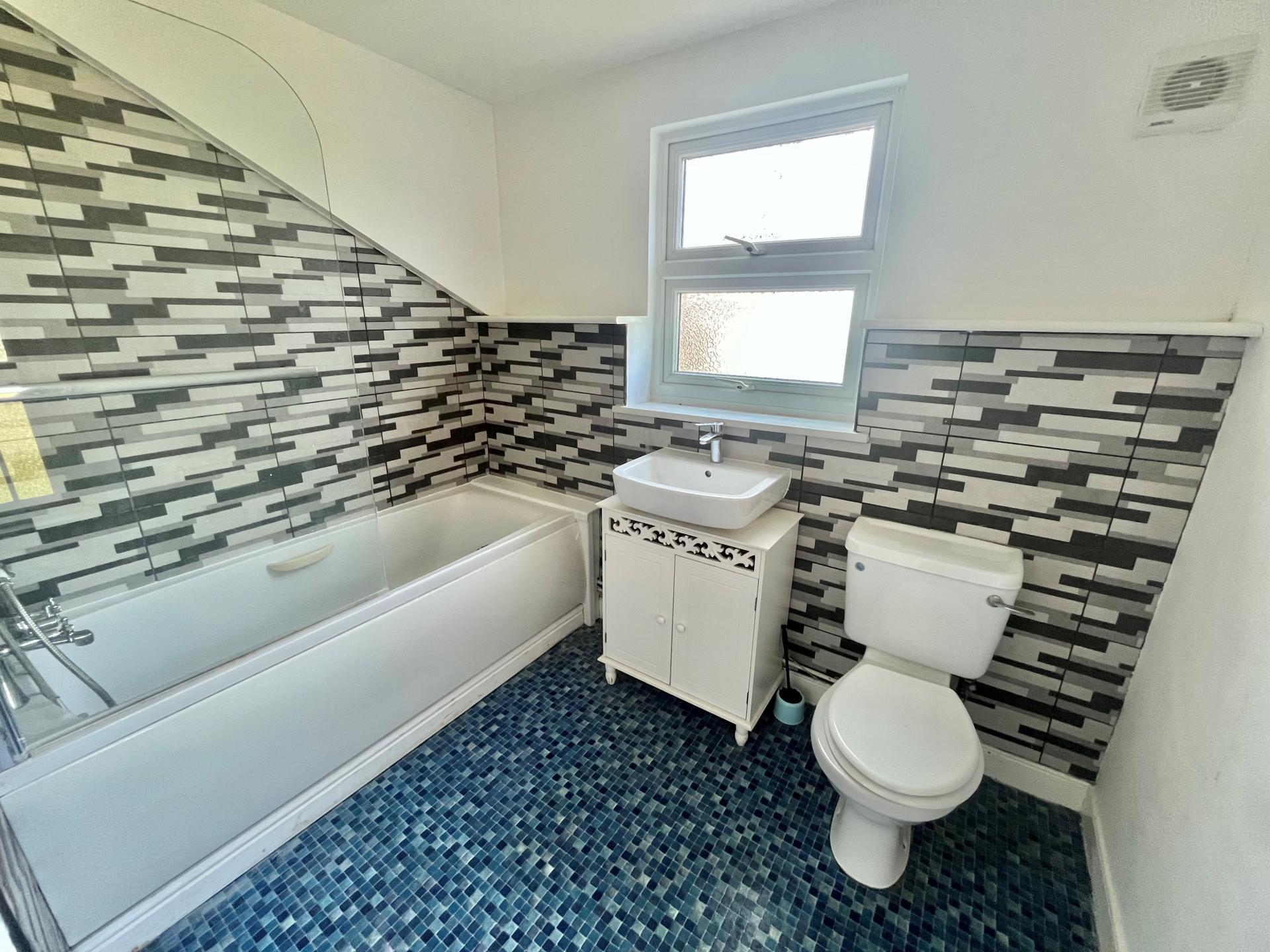 BATHROOM 8' 3" x 6' 4" (2.54m x 1.95m) plus door recess. Three piece suite comprising panelled bath with mixer tap, shower attachment, over head sprinkler with glazed screen, wash hand basin, low level WC, partial wall tiling, extractor fan, ceiling light, radiator, 2 obscure glazed UPVC windows.