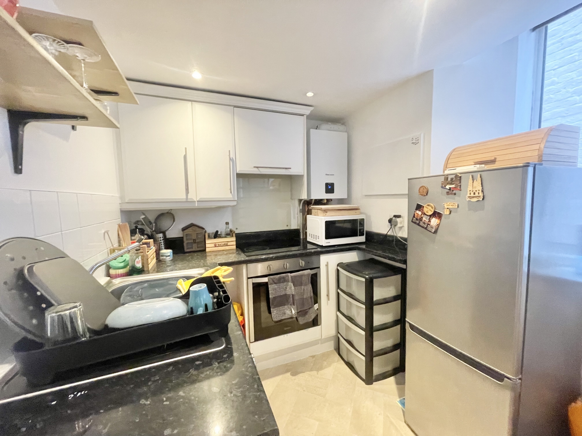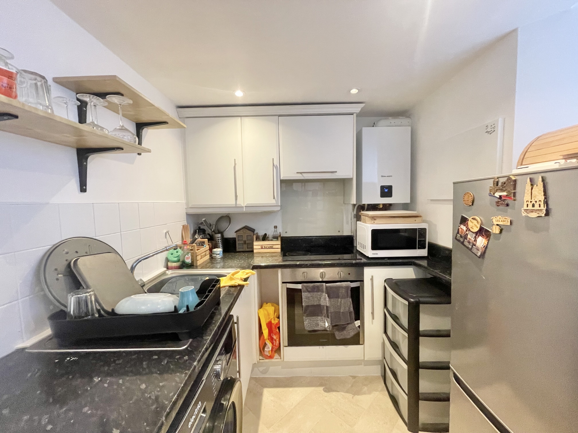 KITCHEN: 2.00m x 1.80m (6'7" x 5'11"), Base cupboards and drawers with worktop over, sink and drainer with mixer tap, built in oven and hob, space for washing machine, space for fridge freezer, wall mounted cupboards, wall mounted boiler.