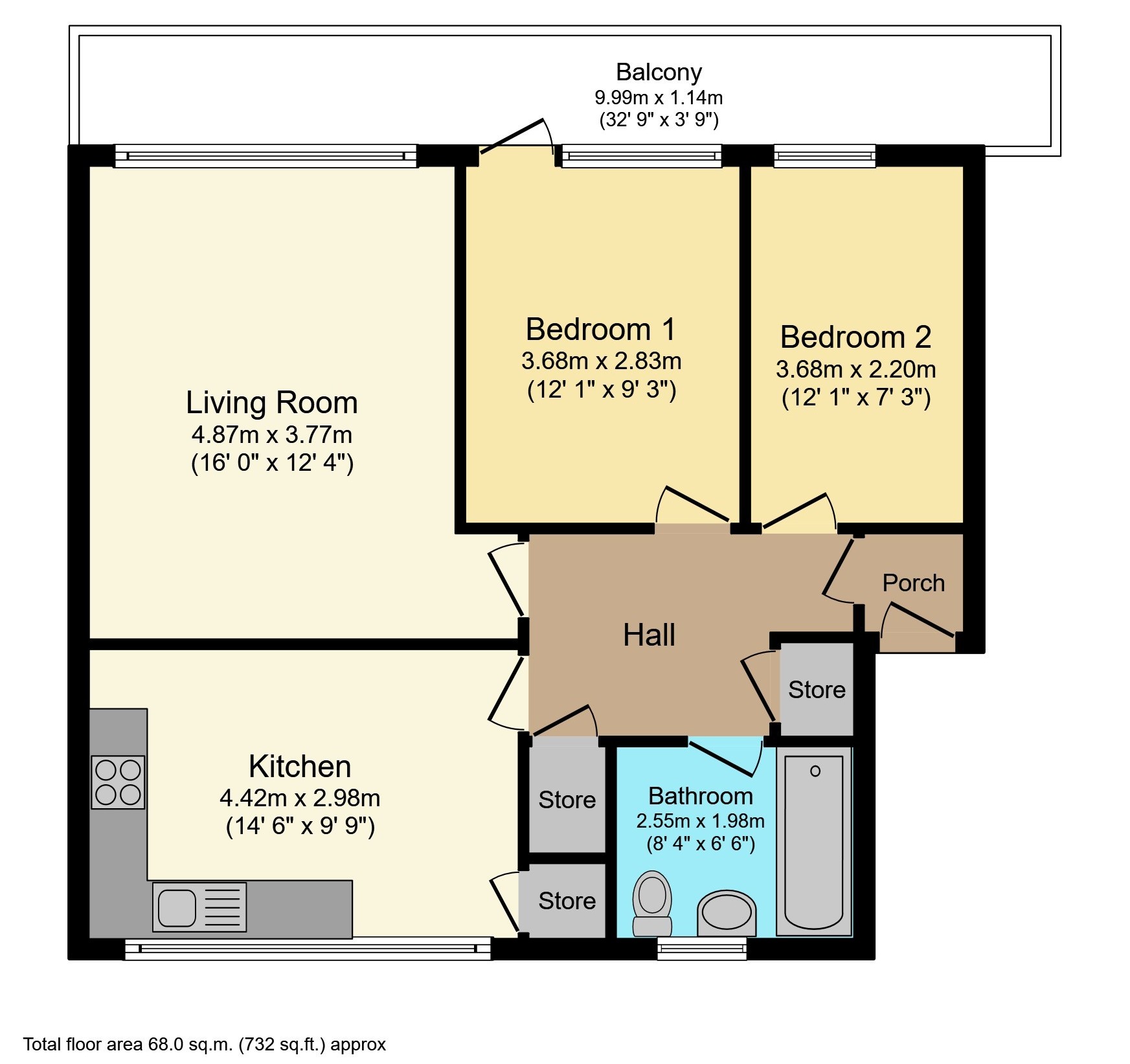 Offering more than 690 square feet of living space, it includes a spacious entrance hall with a storage cupboard, a large living and dining area with a spacious balcony, two double bedrooms, and a family bathroom.