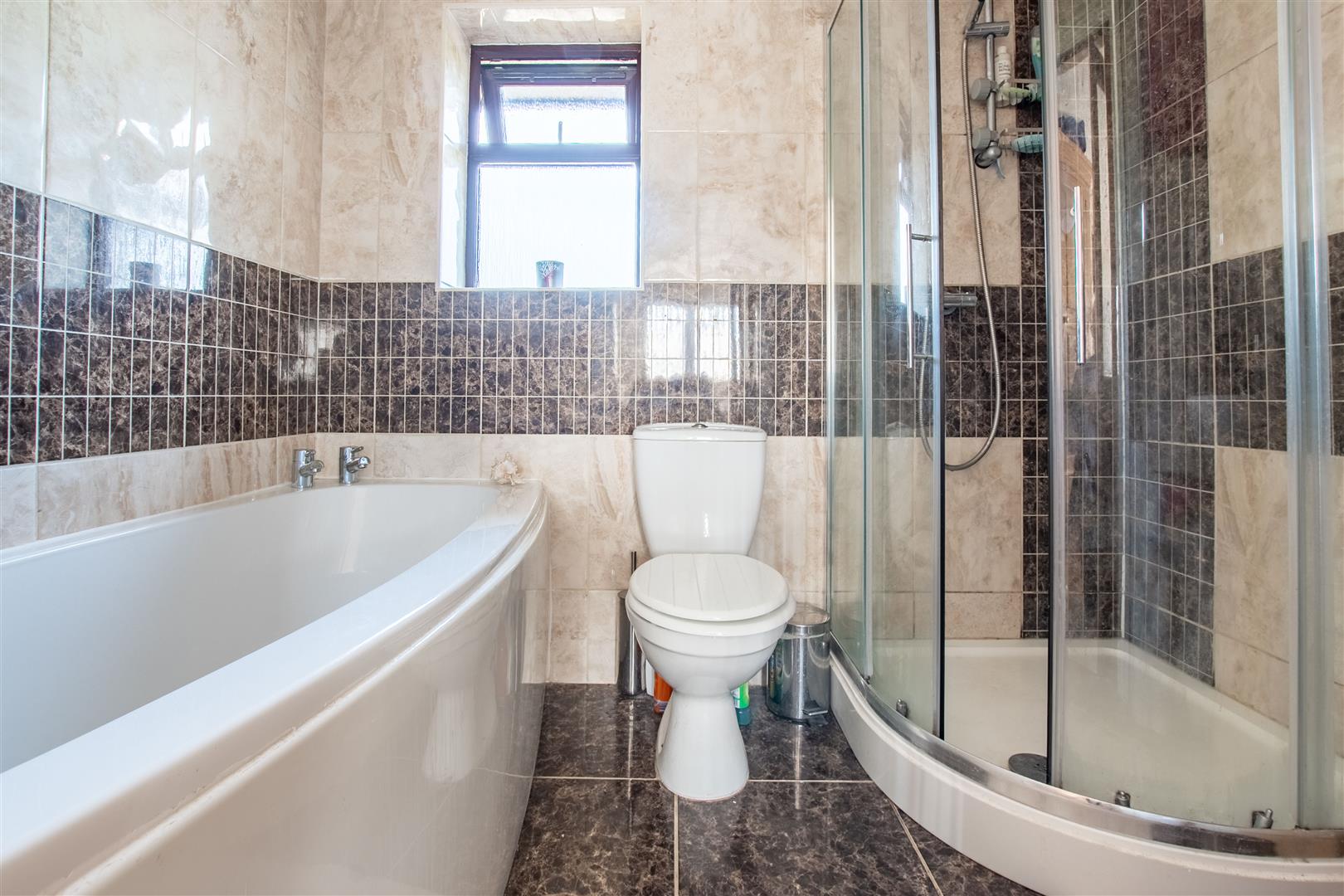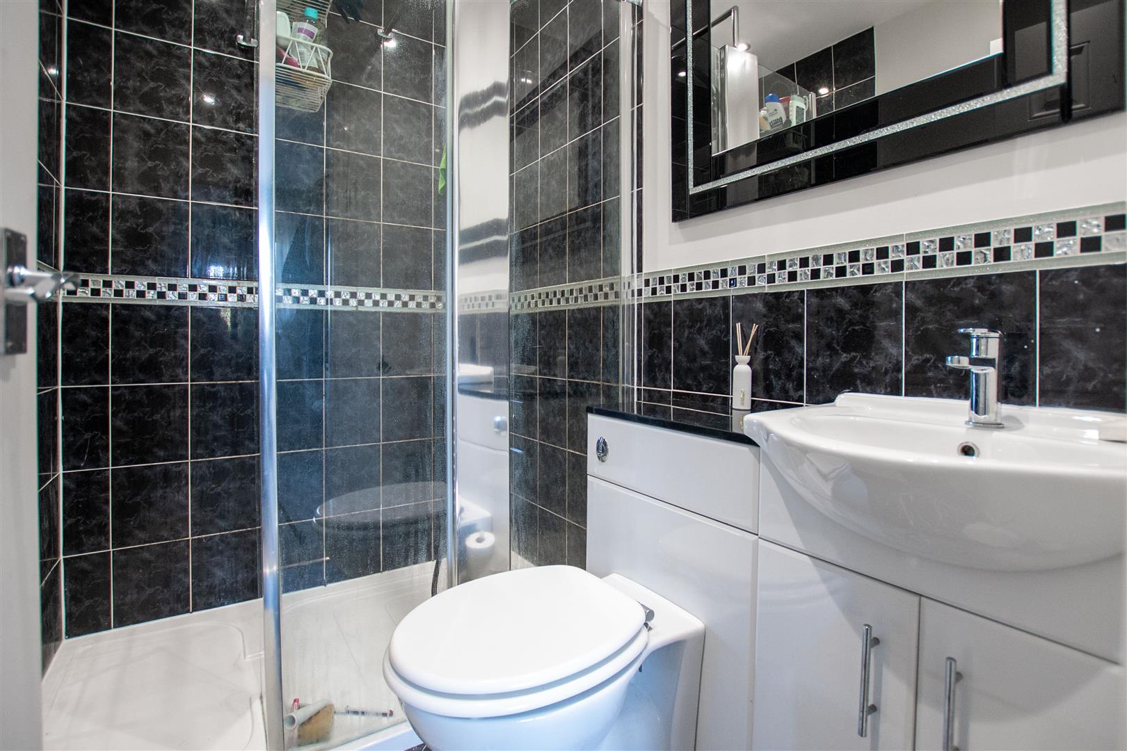 Ensuite - Fully tiled walls, bath, separate shower cubicle, hand wash basin with cupboard beneath and low level WC. Heated towel rail, ceiling spot lights, extractor fan, double glazed obscured window to rear