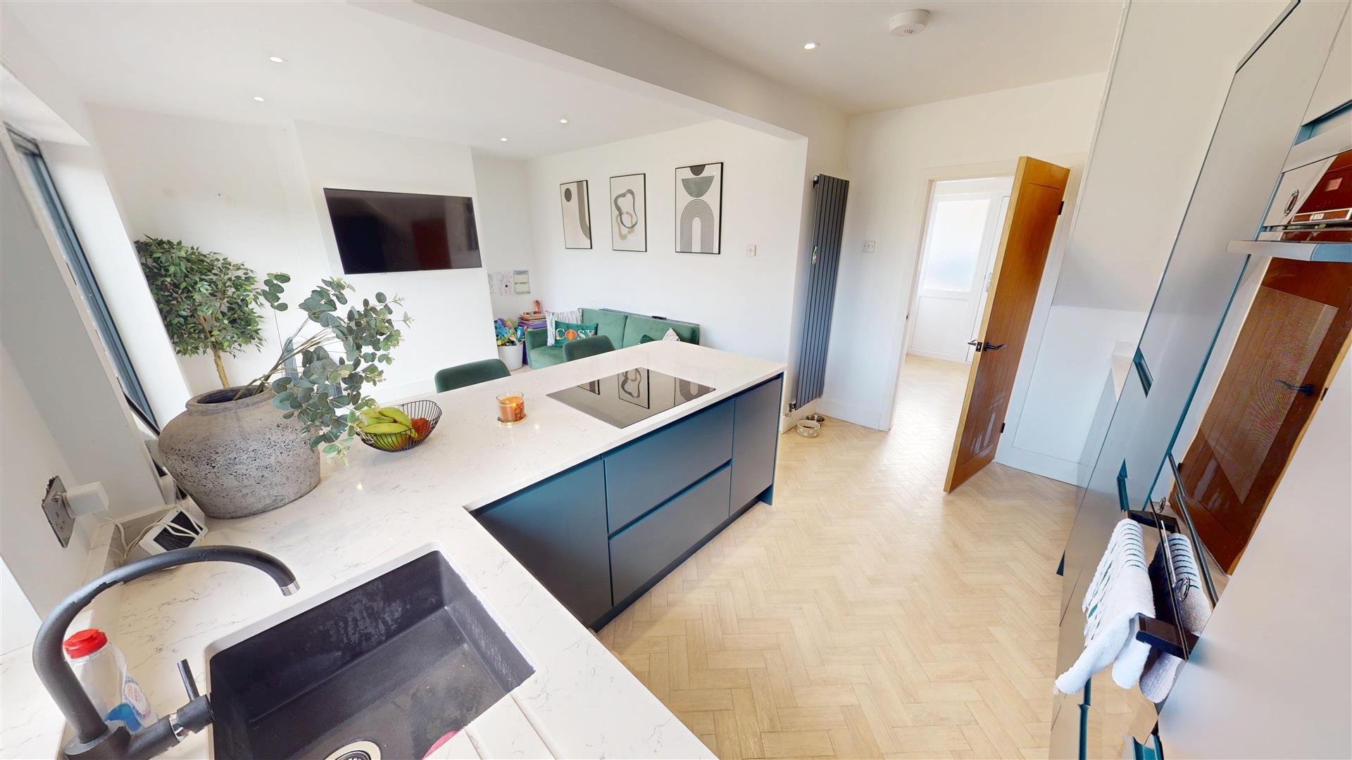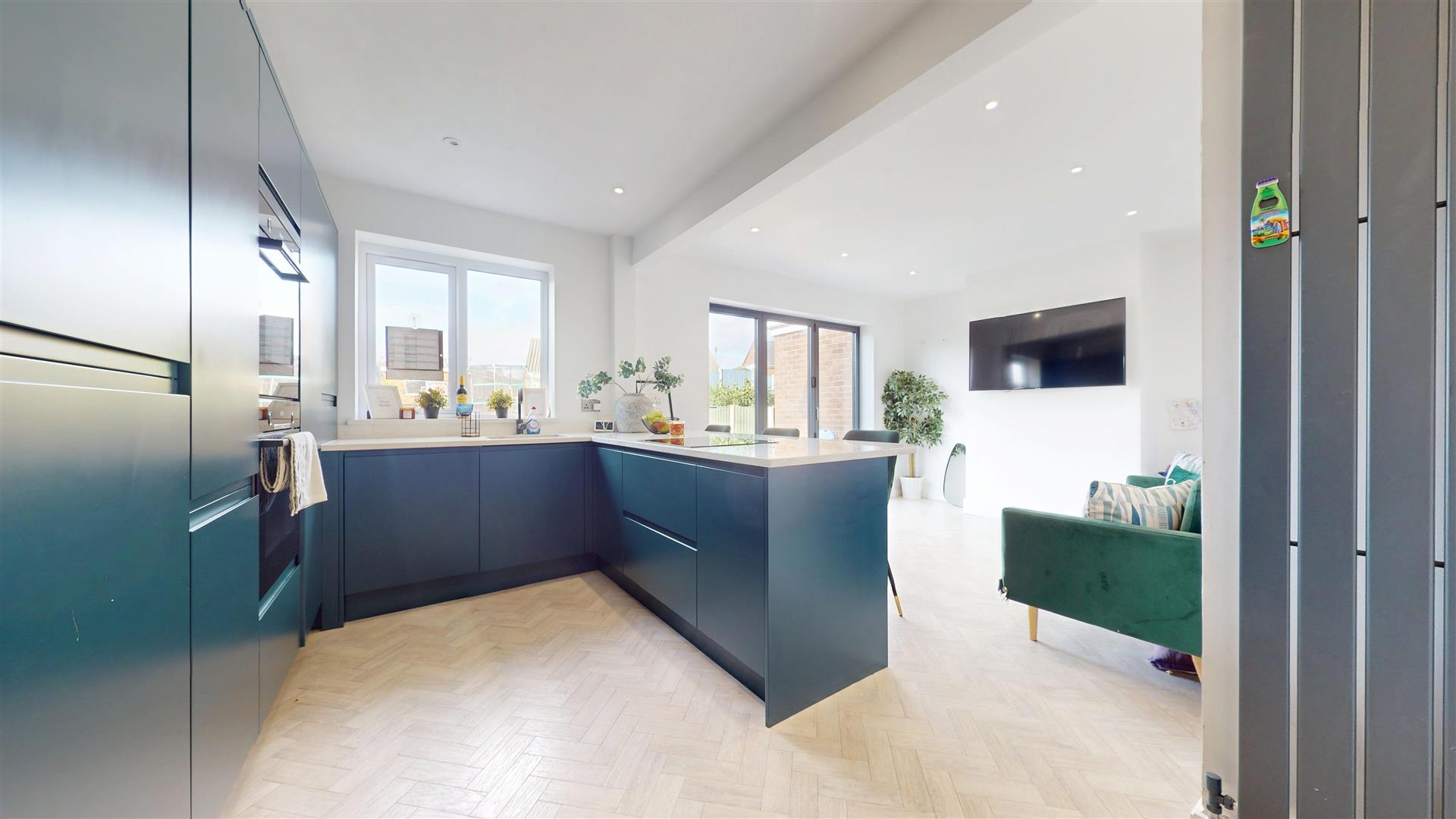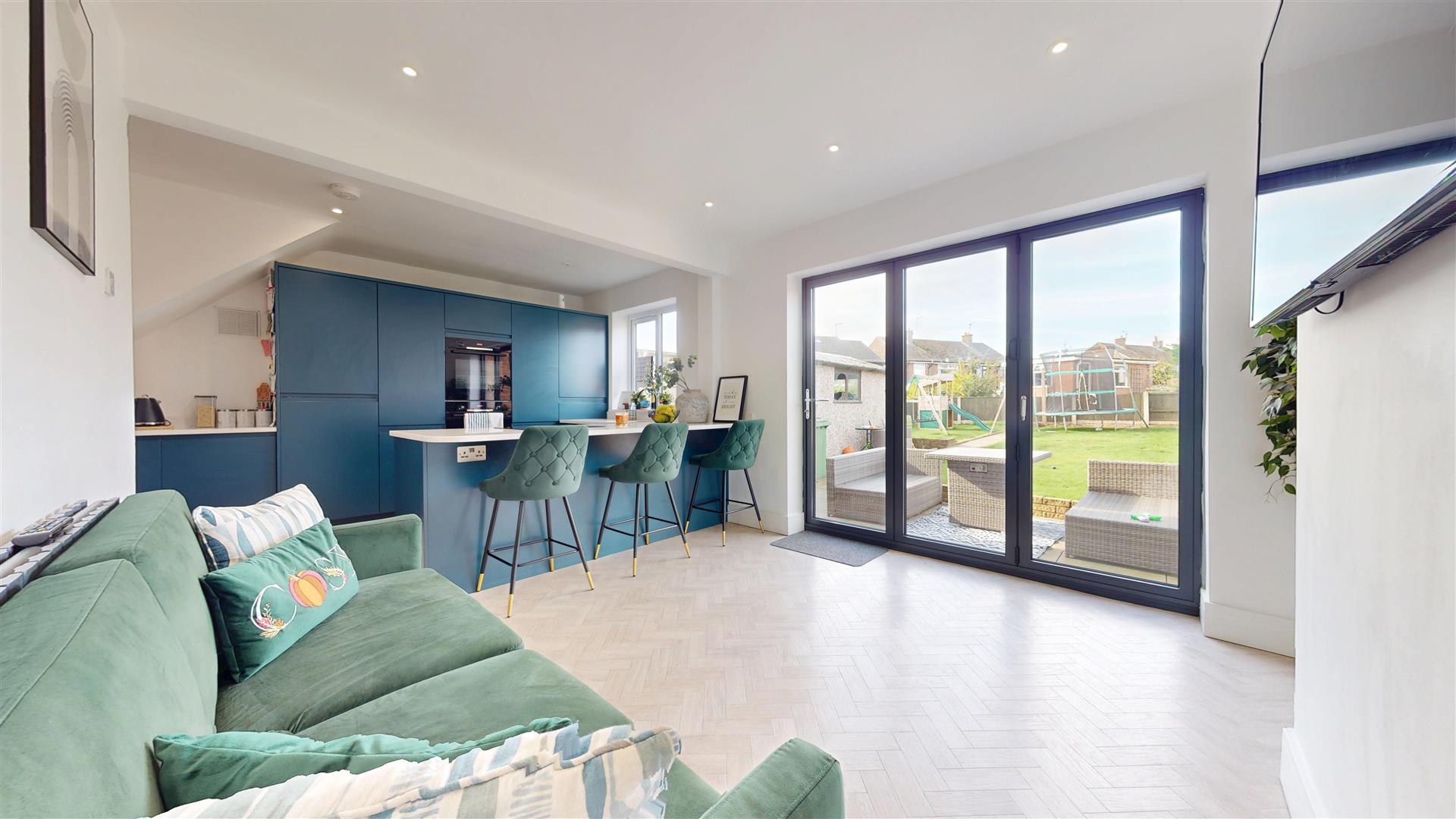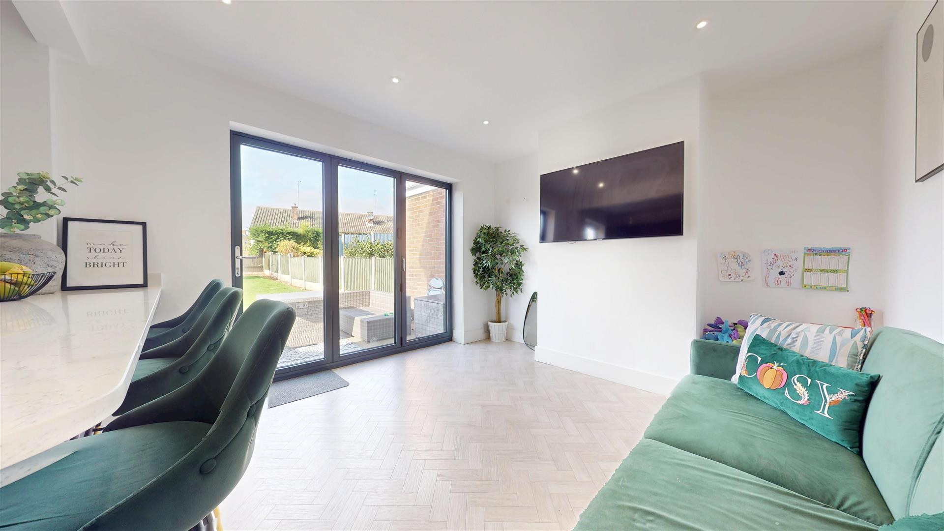 Upon entering, you are greeted by a spacious and welcoming hallway leading to a cosy front living room, beautifully styled and ideal for relaxing evenings. The real highlight of the property lies to the rear - a fabulous open-plan kitchen and dining space, finished to a contemporary standard with integrated appliances and sleek finishes. This space is flooded with natural light through the bi-folding doors that open directly onto the large rear garden, creating a perfect setting for entertaining family and friends.