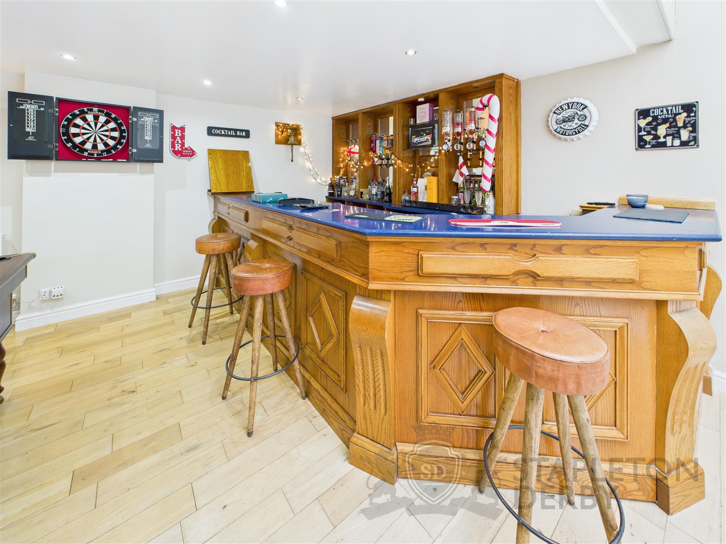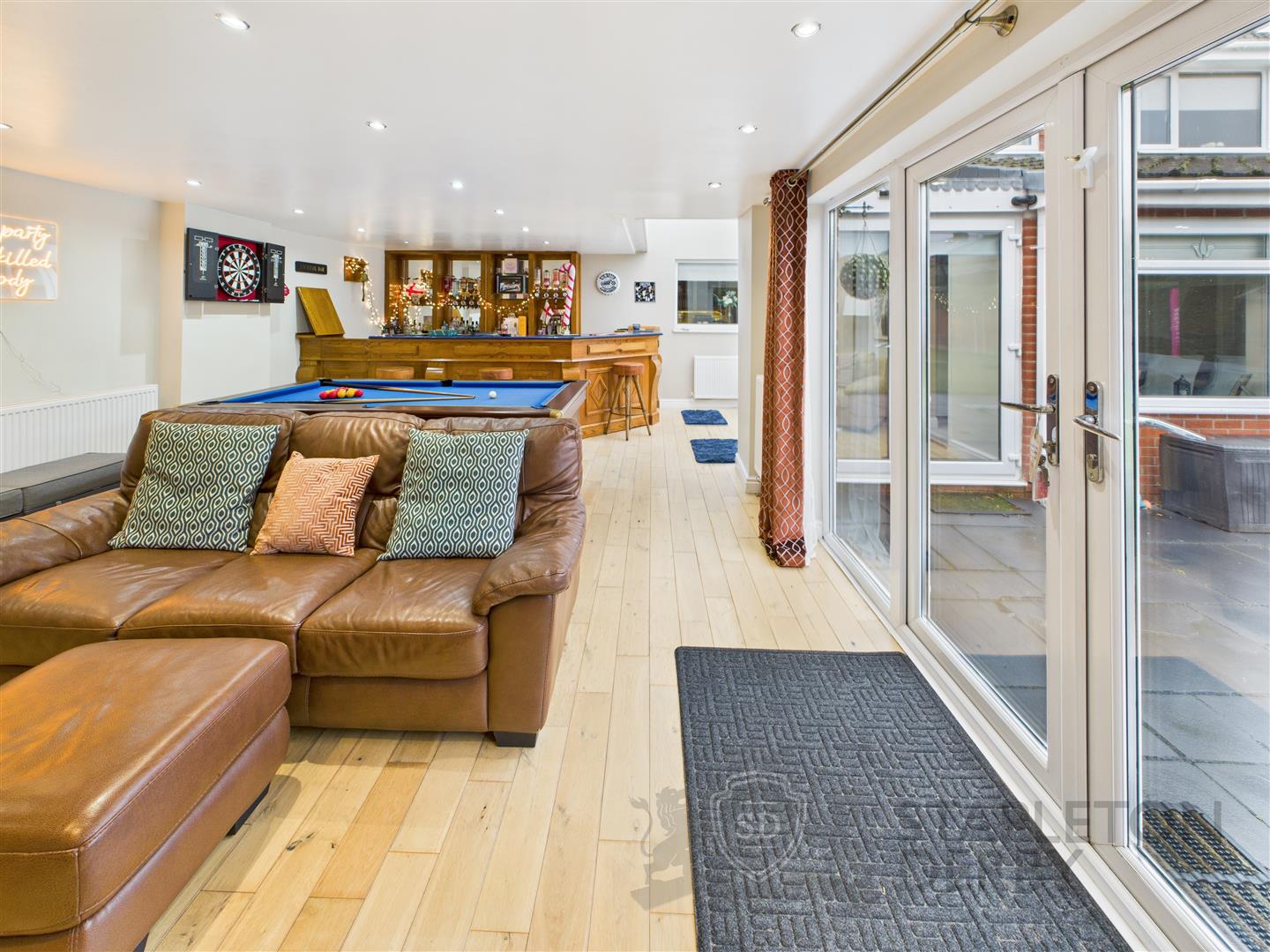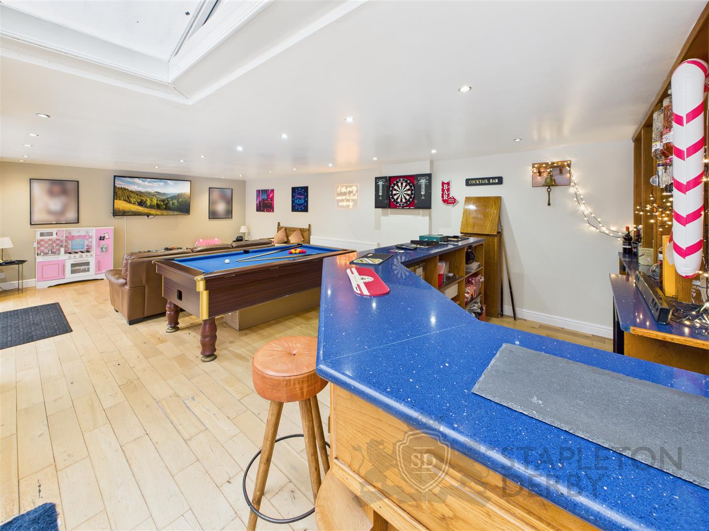 The accommodation begins with an inviting entrance hallway leading to a spacious living room, a downstairs bathroom, and a versatile office or additional ground-floor bedroom complete with its own ensuite. The heart of the home is the open-plan kitchen and dining area, complemented by a separate utility room, all flowing seamlessly into an unexpected and remarkable extension that incorporates a snug, bar area, games room and cinema room, each enjoying direct access to the rear garden.