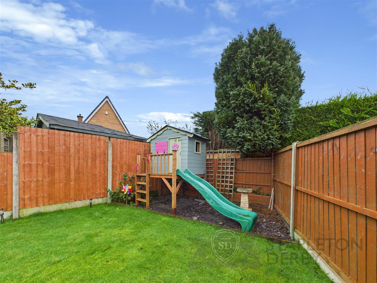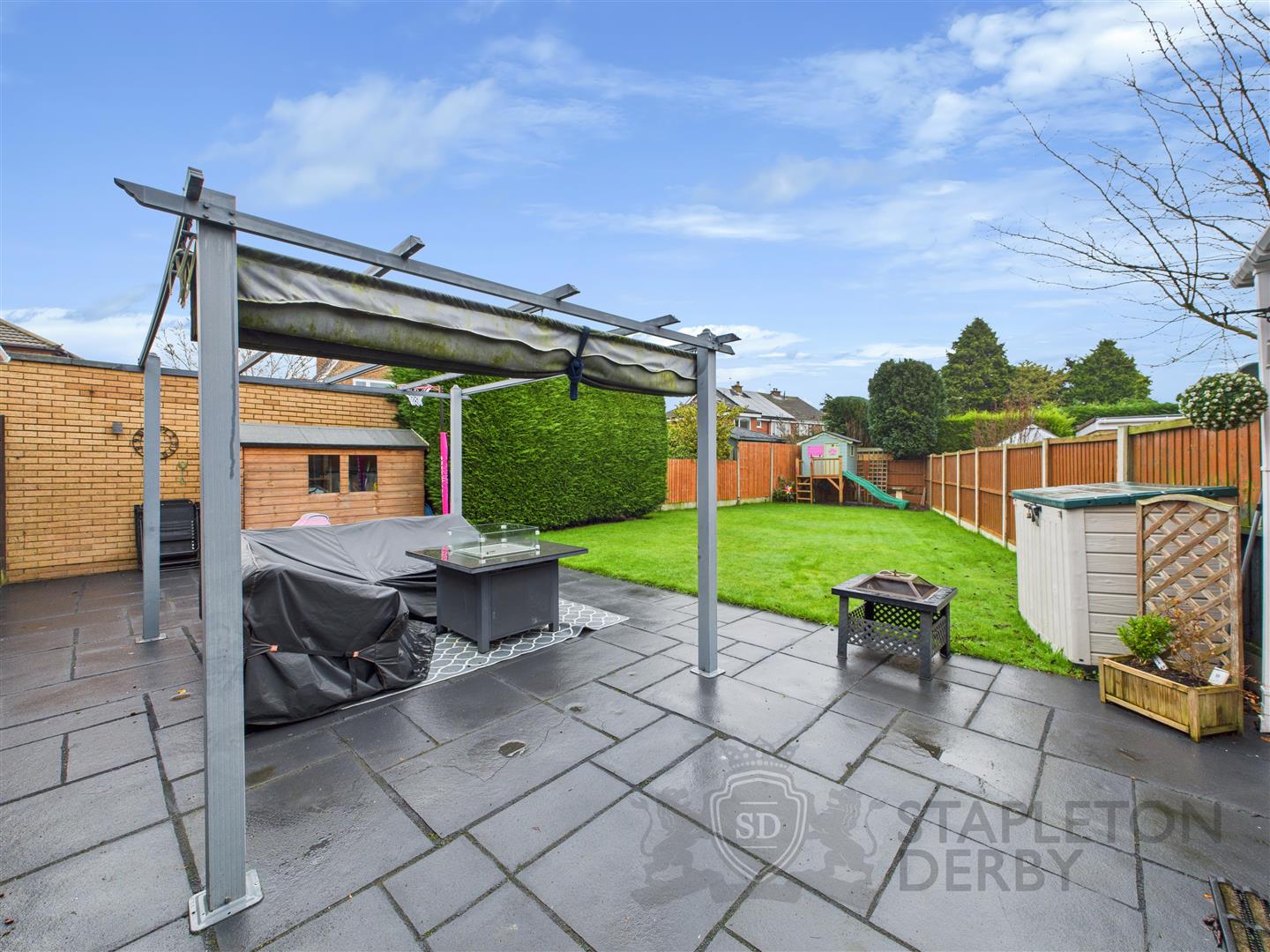 Externally, the property is finished in modern render, giving it a rich and contemporary appeal, and benefits from ample off-road parking for multiple vehicles. The rear garden features a patio area ideal for outdoor dining, a generous lawn and a dedicated play area at the far end, creating a perfect space for family life.