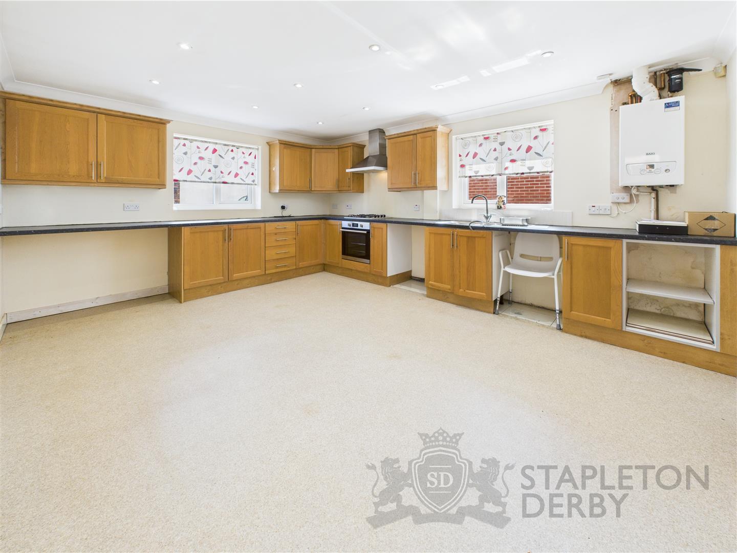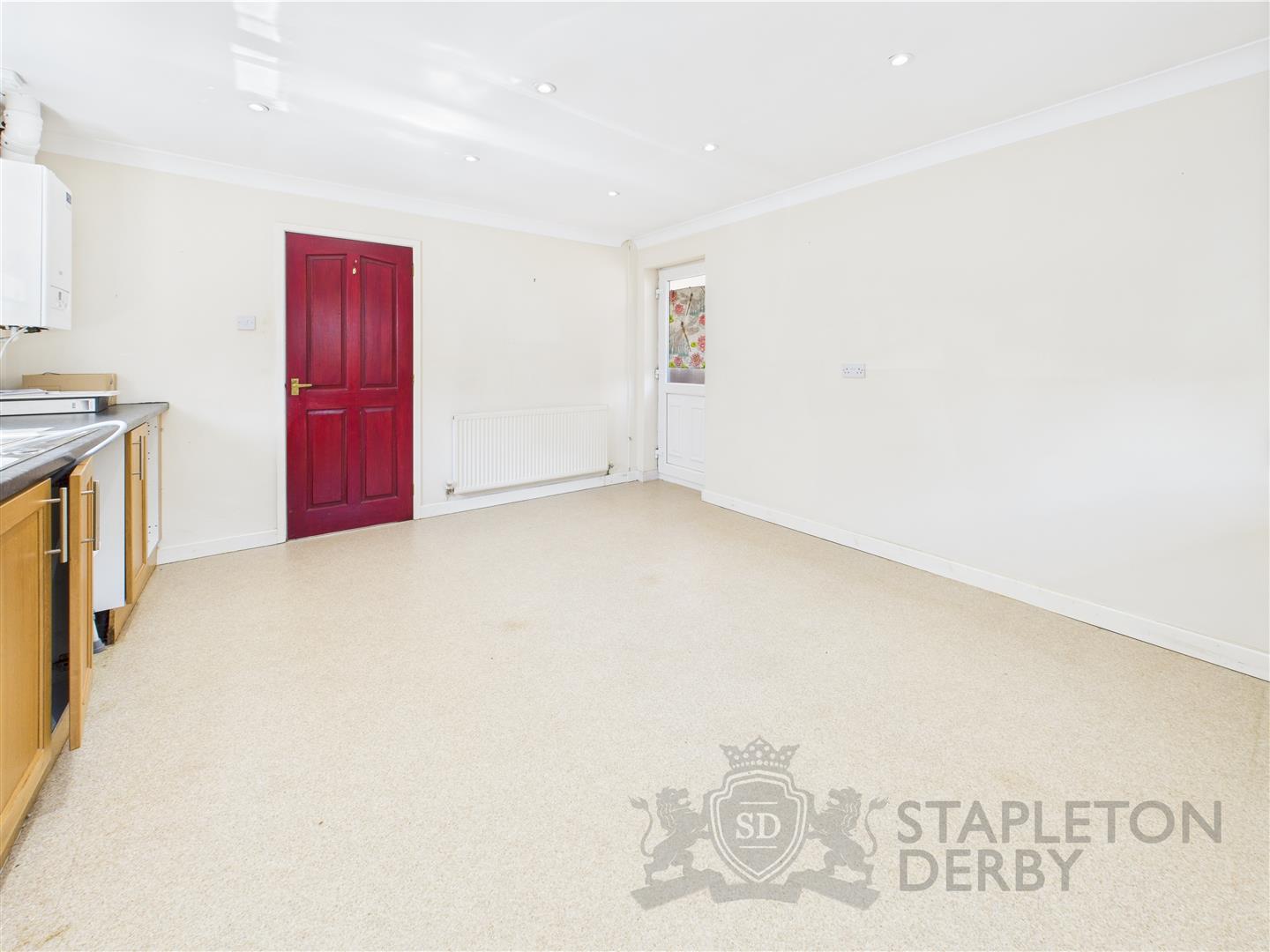 4.95m x 4.09m - Fitted with a ceramic tiled floor and a range of base and wall units with contrasting worktops over. Built in oven with hob over and extractor chimney. Plumbed for washing machine. Coved ceiling with spotlights. Space for dining table. Space for whitegoods. Windows to two sides. Double glazed door to the rear. Radiator. Central heating boiler.