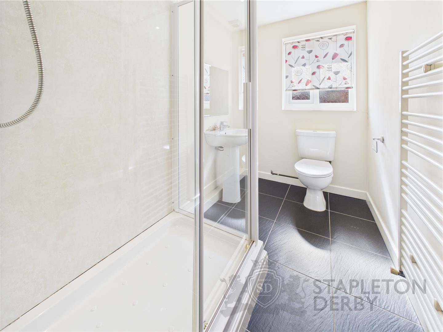 Ensuite comprising: shower cubicle, pedestal wash hand basin, wc, heated white towel rail, ceramic tiled floor and opaque double glazed window.