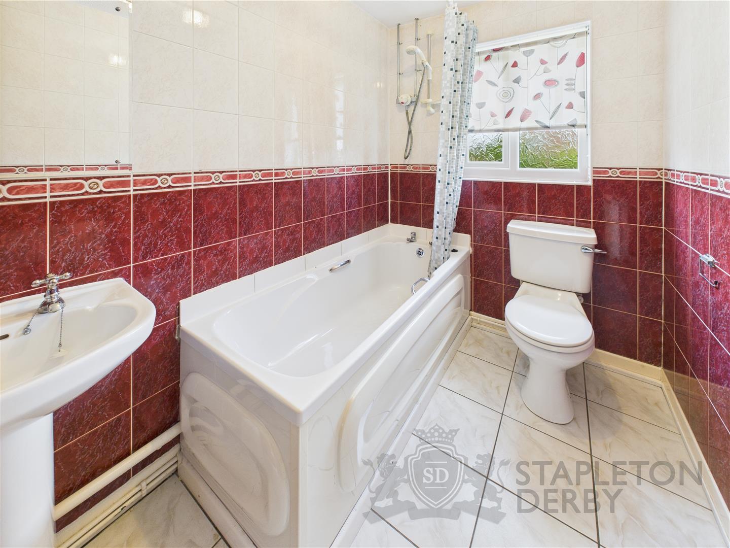 Ceramic tiled floor with fully tiled walls. 3 piece suite in white comprising: wc, pedestal wash hand basin, panel bath with shower over, opaque double glazed window, textured ceiling.