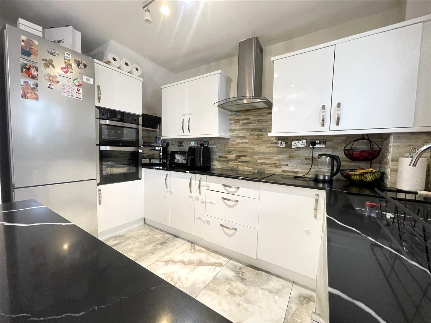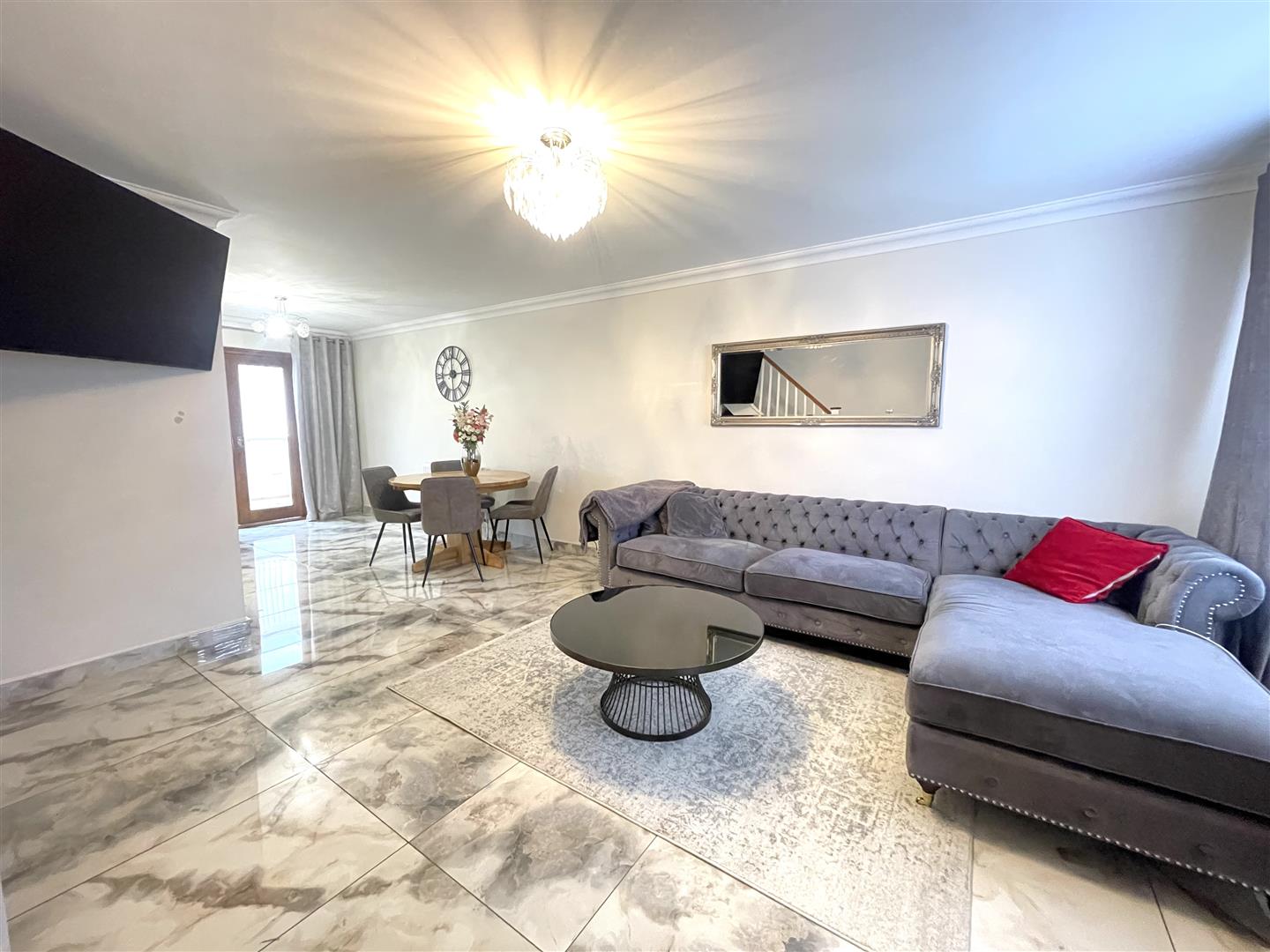 - Spacious open plan lounge, kitchen, and dining area with stylish tiled flooring