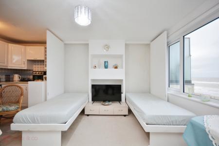 This unique studio apartment is an ideal holiday home or bolt hole, boasting a spacious open-plan living area that seamlessly blends functionality and comfort. From here, you'll have access to a private storage room, offering extra space for your belongings. The property also includes a shared garage, a rare and highly sought-after feature in this prime location.