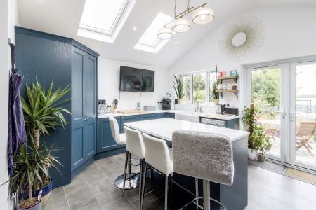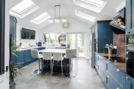 - Stunning kitchen/breakfast room extension with blue Shaker cabinets and quartz worktops