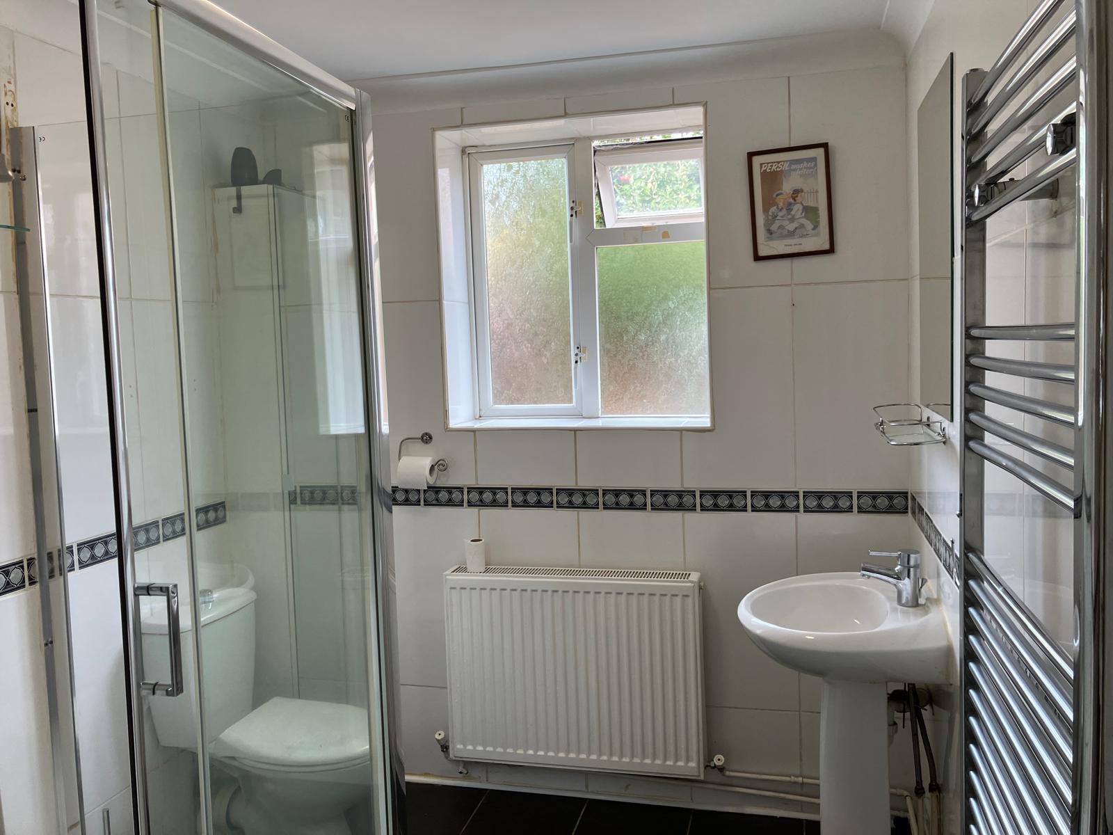 SHOWER ROOM Fitted with a pedestal basin, low-level WC, shower enclosure with sliding door, tiled walls and floor, bathroom mirror cabinet, radiator, rear-aspect window.