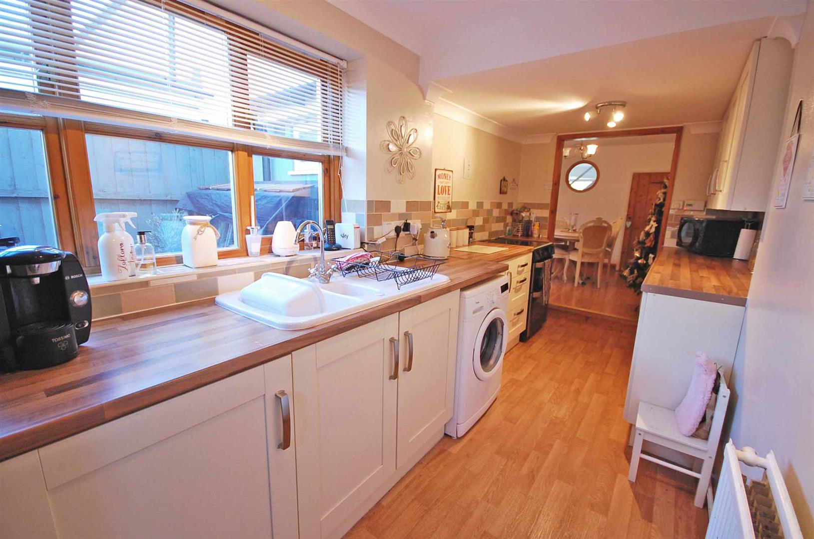 Double glazed window to side aspect, a series of matching base and wall units with roll top work surfaces, incorporating one and a half ceramic sink with central mixer tap and drainer, space for cooker with electric hob, space for fridge/freezer, integrated washing machine and tumble dryer, radiator, laminate flooring and smooth coved ceiling. Stable door to rear garden.