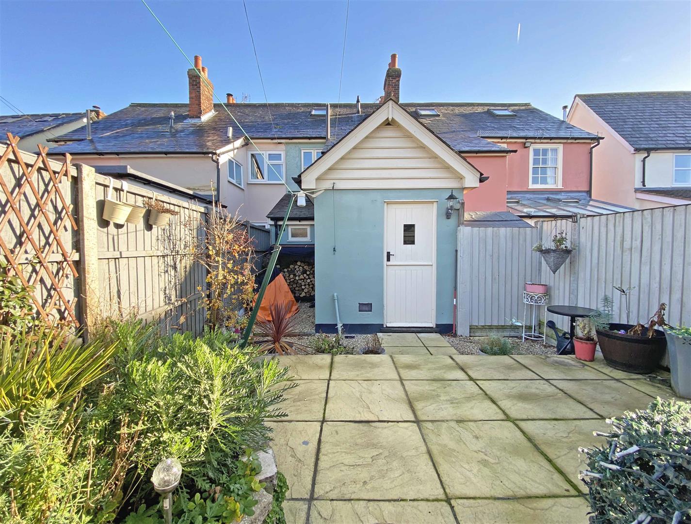 Fenced rear garden, hard landscaped with shingle areas to each side, log store to side recess and gated rear access (onto Gore Lane).