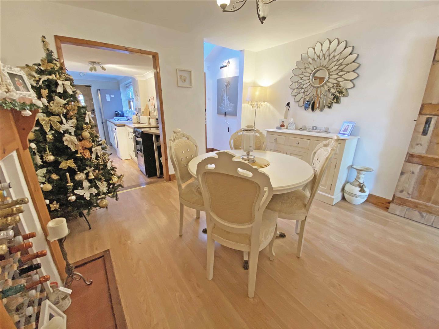 Storage cupboard, feature fireplace, radiator, laminate flooring and smooth ceiling. Door to cloakroom and open to kitchen.