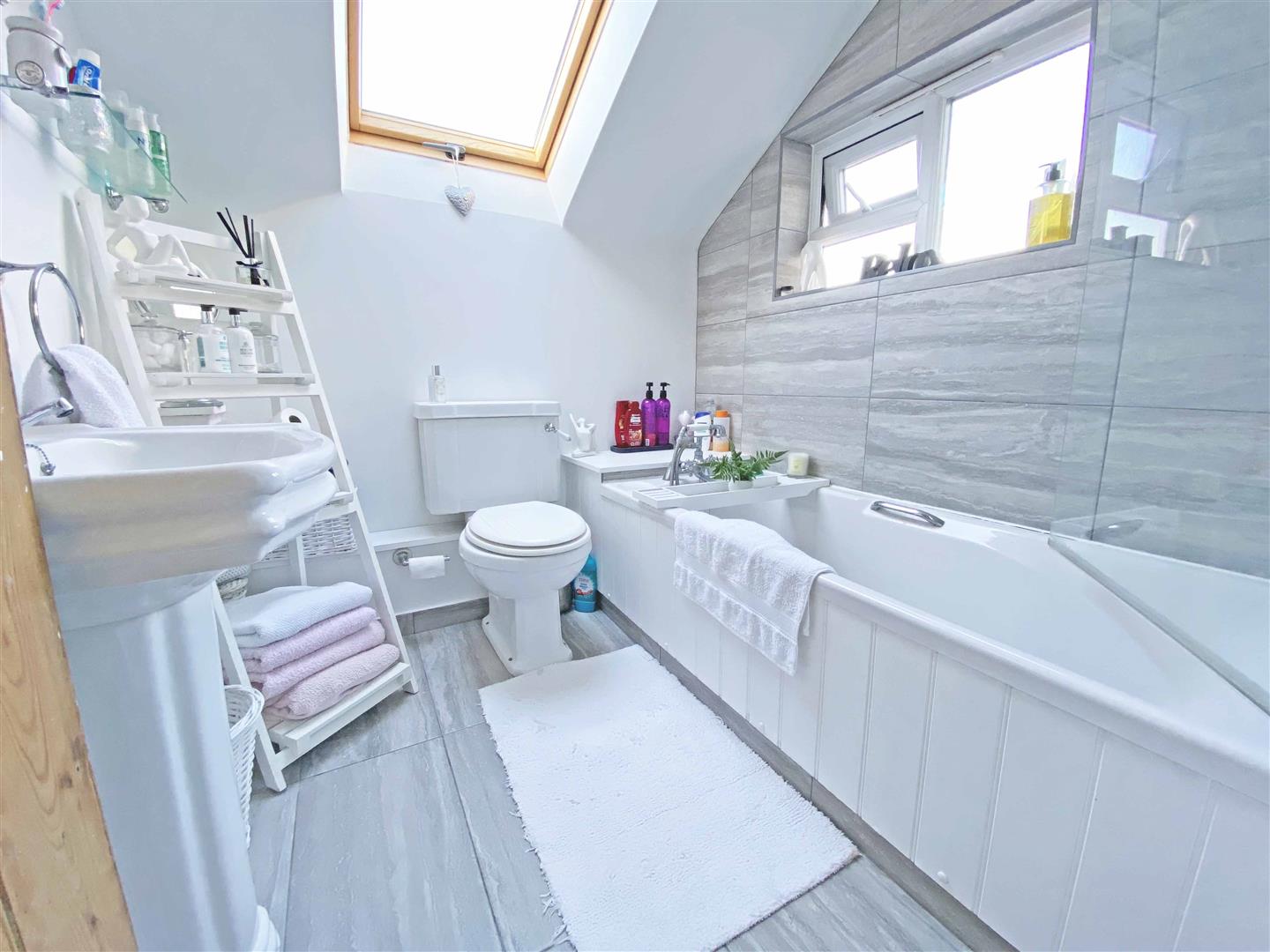 Opaque window to side aspect and Velux to rear aspect, panelled bath with central mixer tap and shower attachment, low level WC, pedestal wash hand basin, heated towel rail, extractor, tiled flooring and smooth ceiling with sunken spotlights.