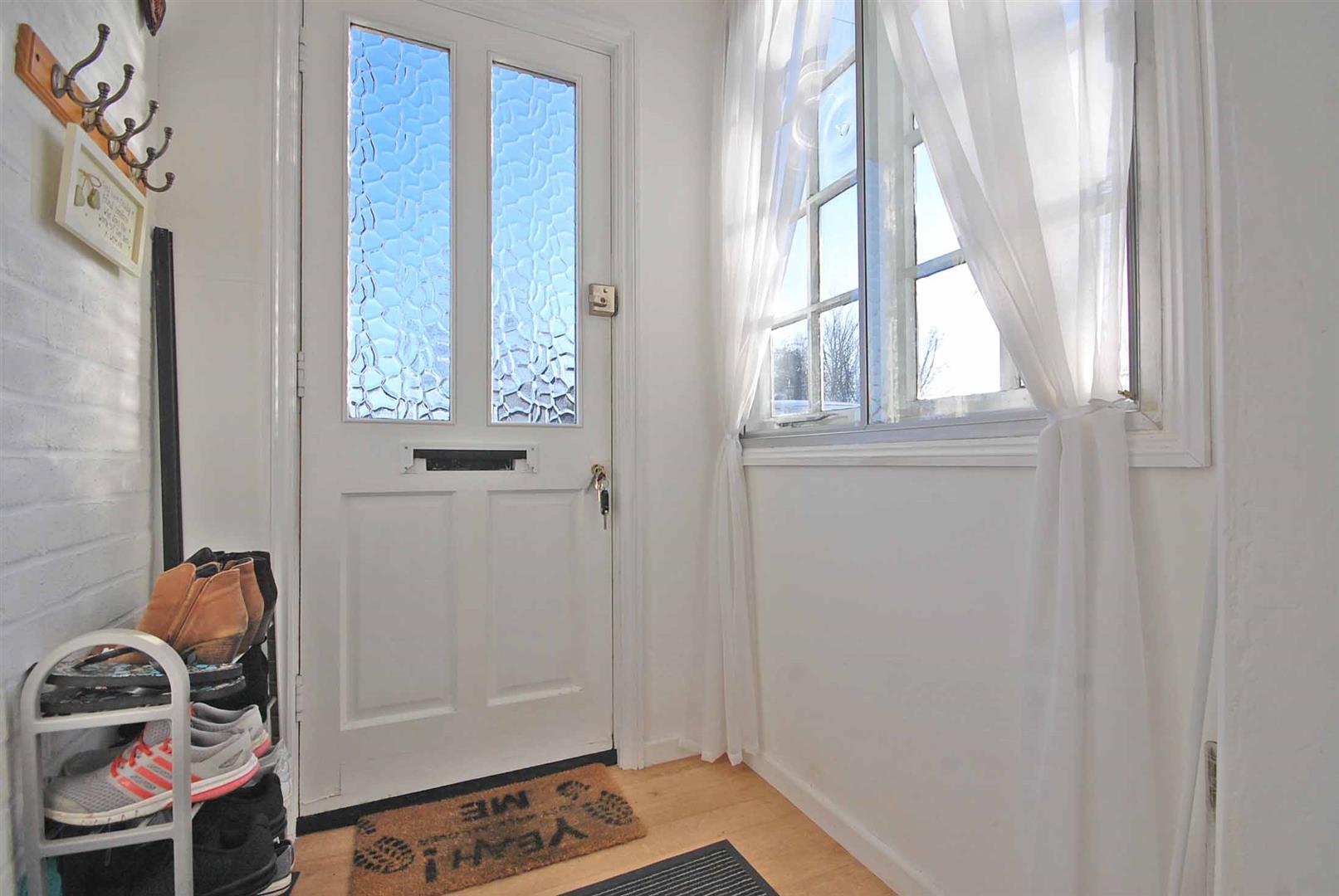 Part-glazed entrance door, window to side aspect with secondary glazing, wooden flooring and smooth ceiling. Door to lounge.