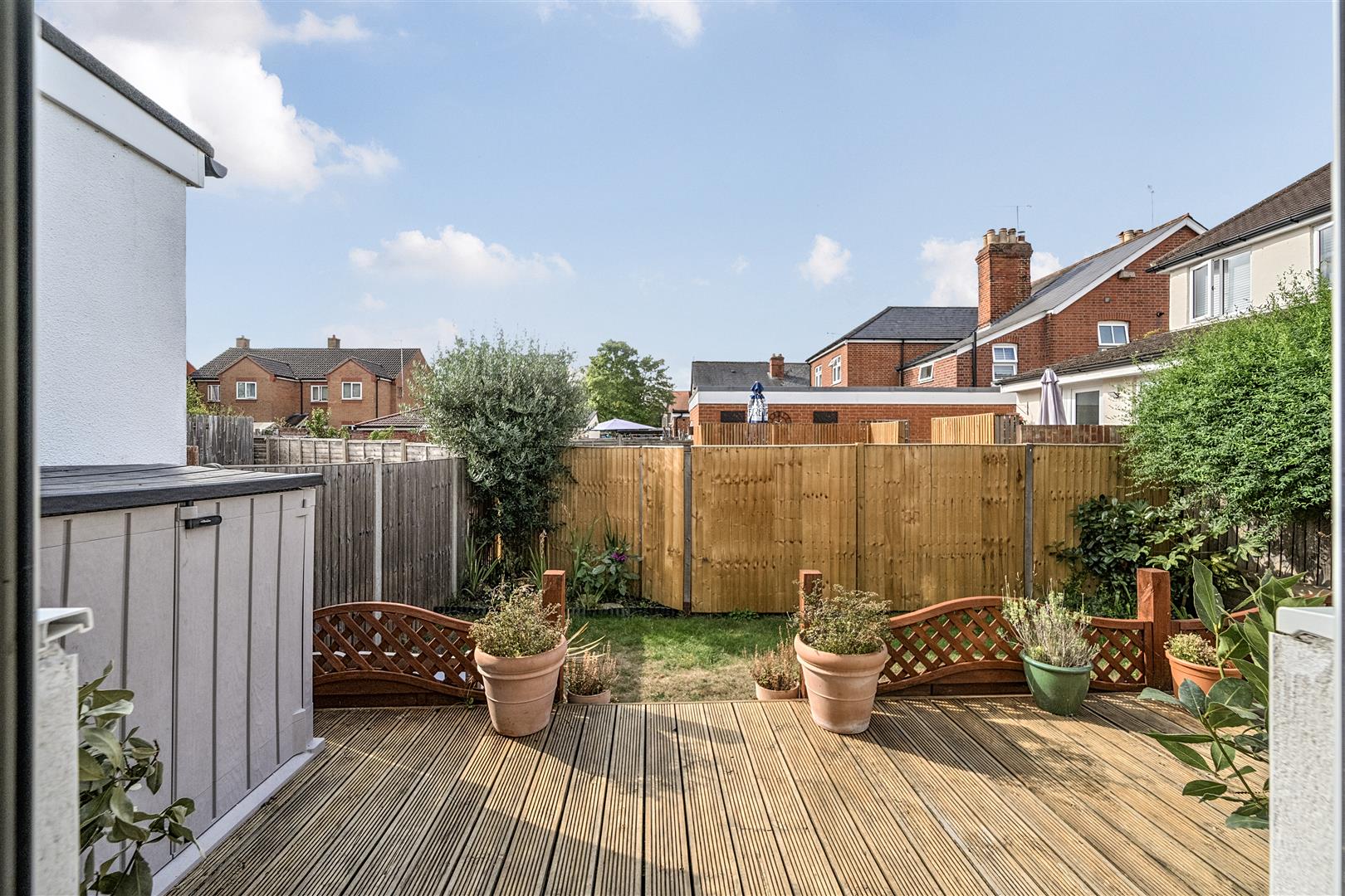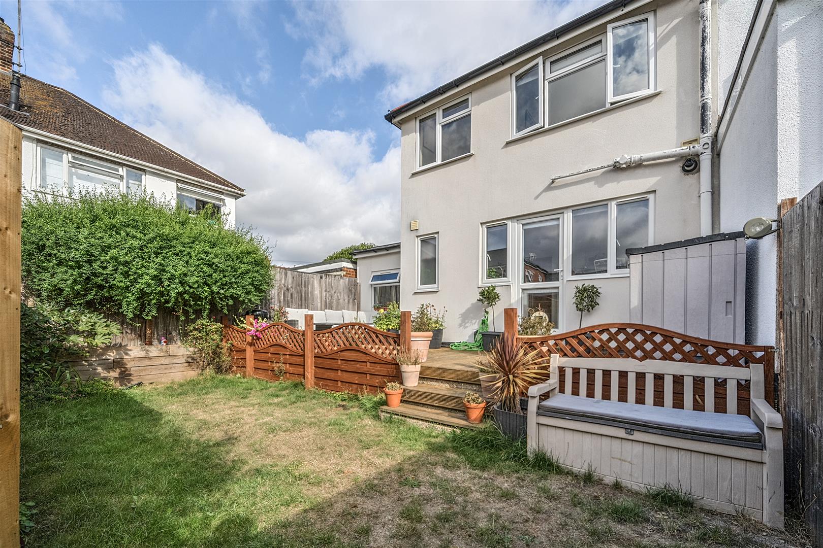 An easy to maintain south facing garden that is partly laid to lawn with a raised decked terrace that is ideal for summer entertaining.