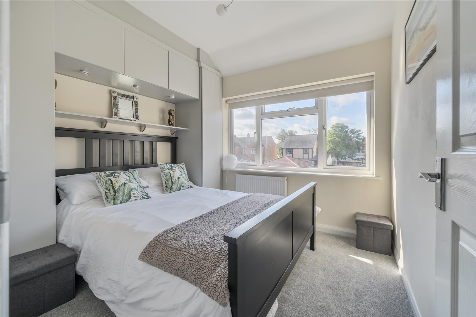 Offering view over the rear garden is this good sized room, carpeted and fitted wardrobes.