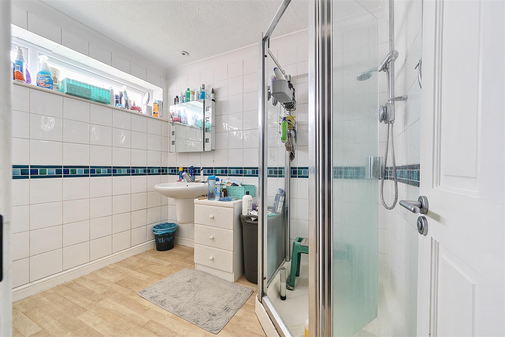 A modern and stylish bathroom comprising of a good sized shower, WC, wash hand basin, frosted windows to the front and tiled walls.