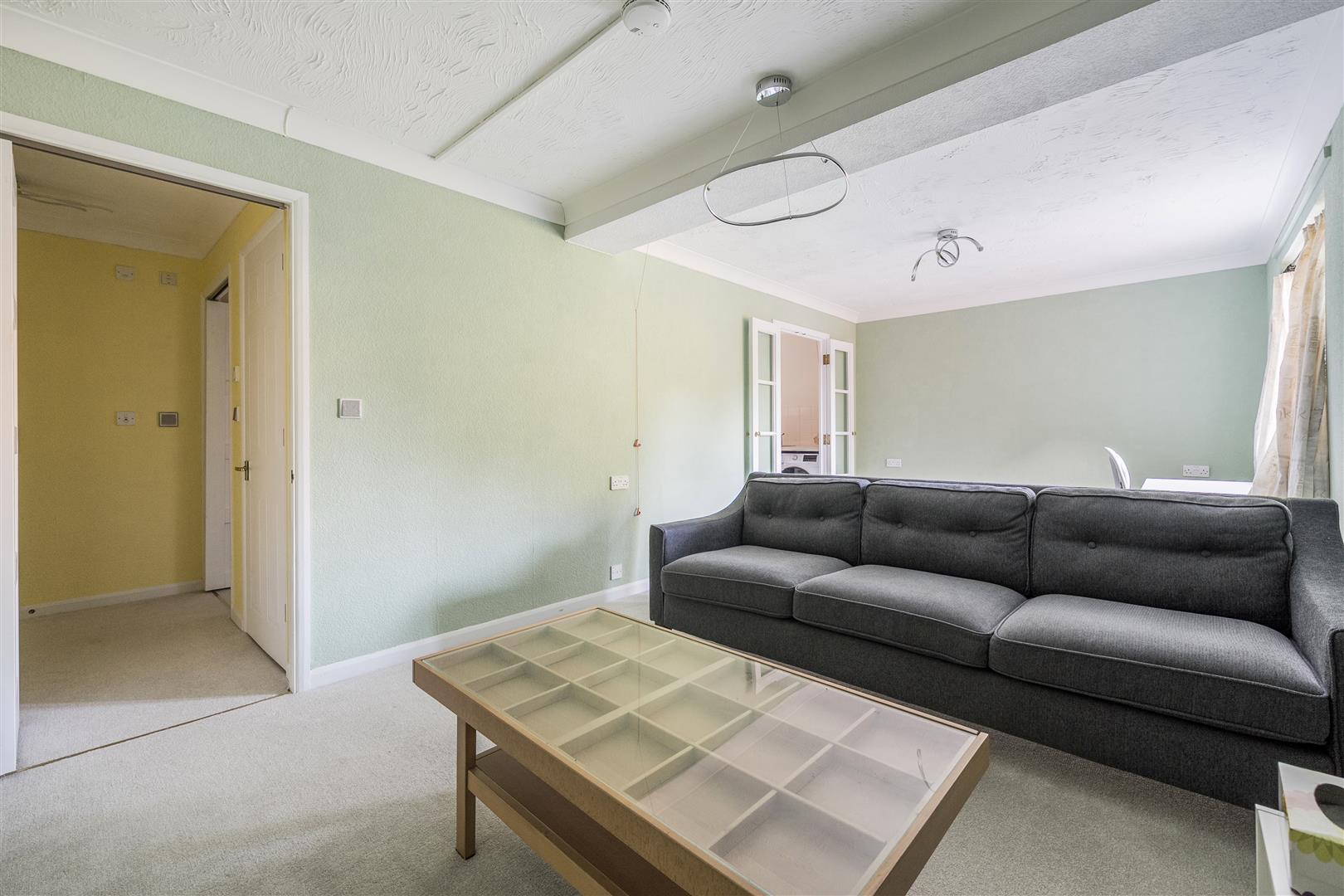 A spacious living room with carpet, window overlooking communal grounds and double doors to kitchen.