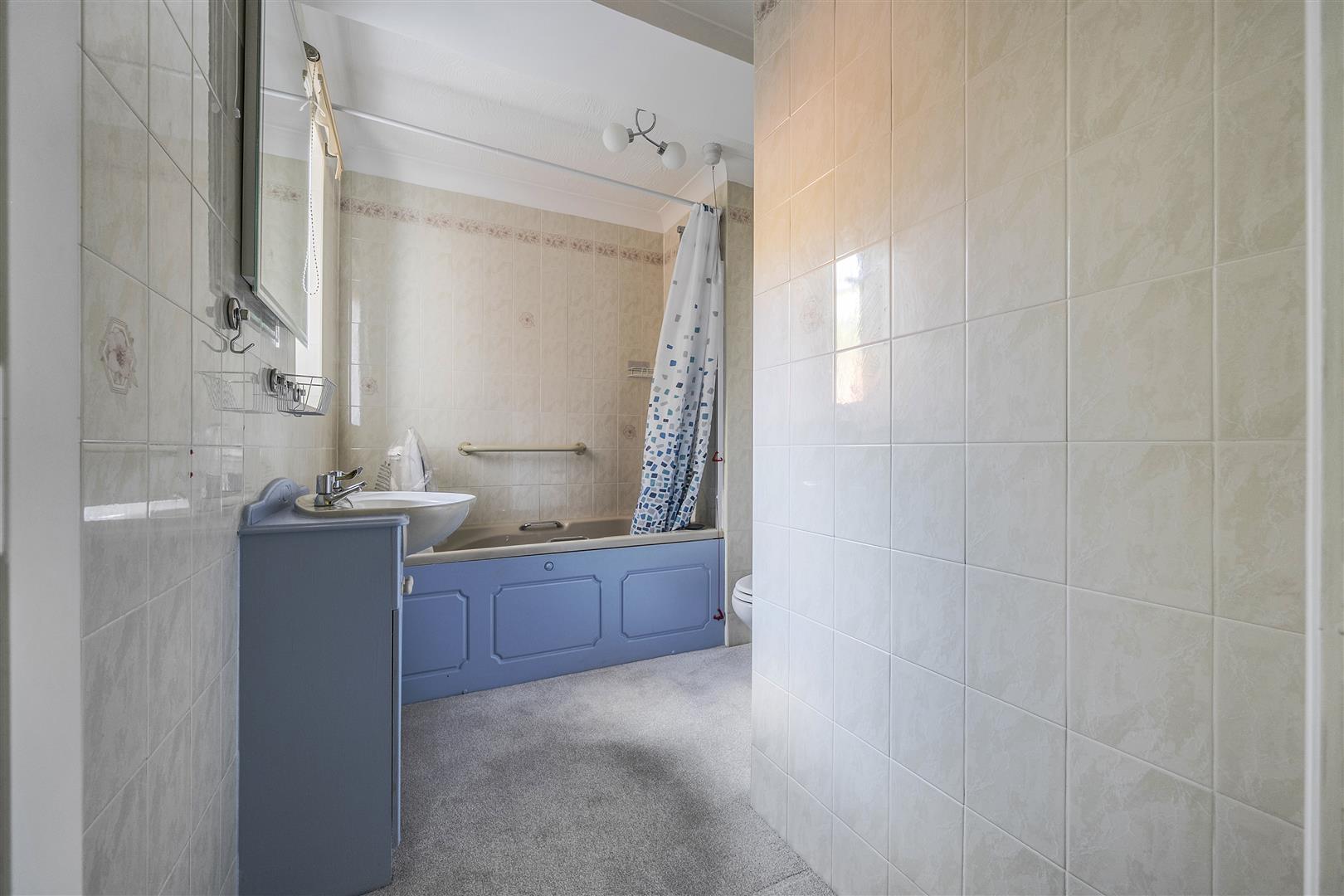 A large carpeted bathroom with window overlooking the side of the development. Three piece suite comprising of wash hand basin set into vanity unit, bath with shower over and W.C.