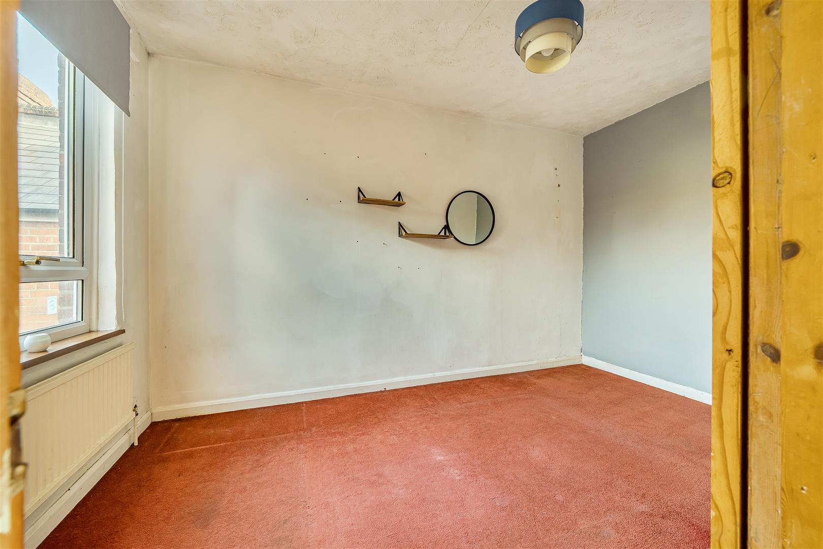 Double bedroom with carpeted floor and large window overlooking rear garden.