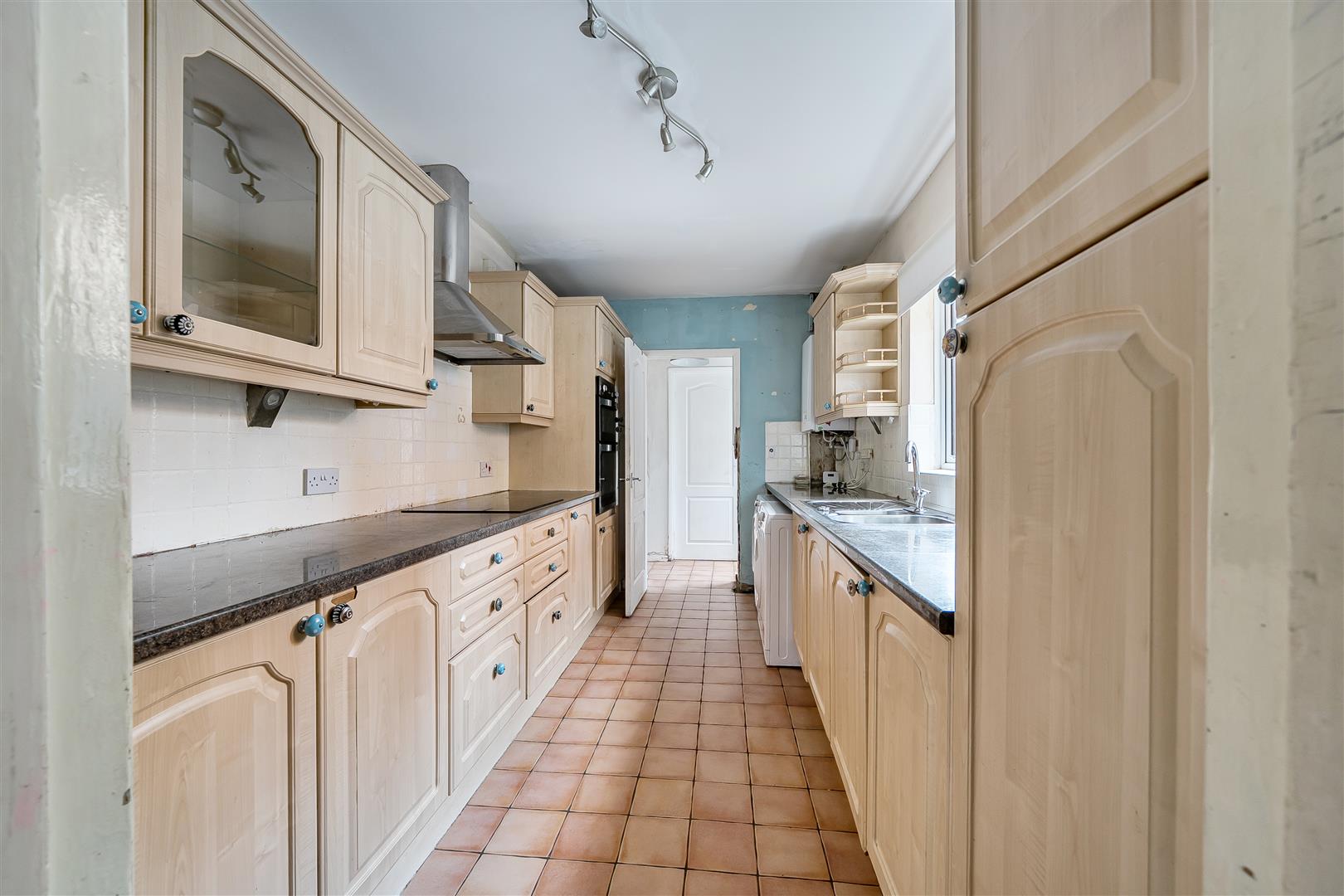 Generous galley kitchen with ample cupboard space from base and wall units. Tiled splashback and roll top work surfaces over recess for washing machine and tumble dryer or dishwasher. Wall mounted combi boiler, four ring hob and vented extractor. Large window out to garden. Door to the garden and bathroom.