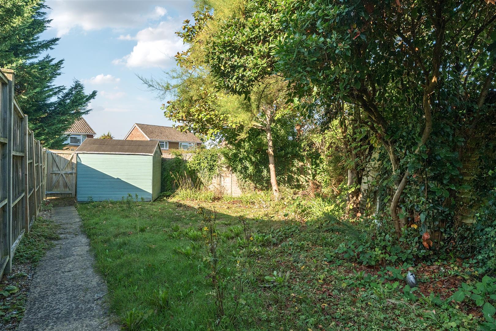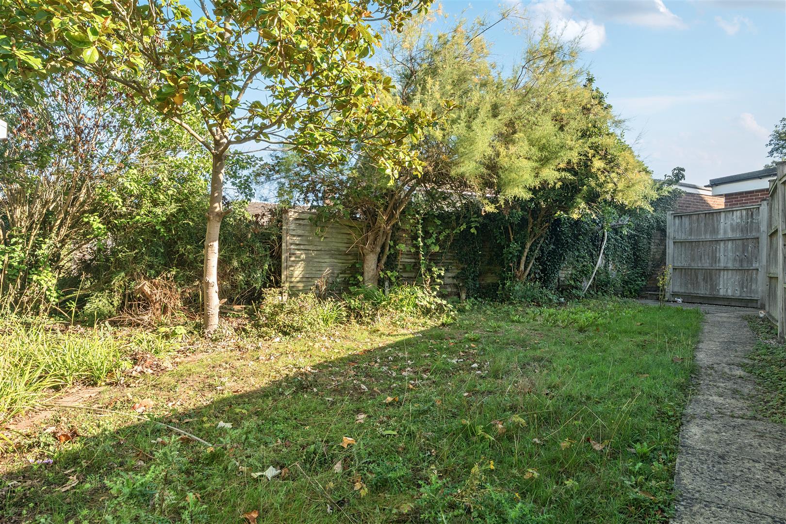 Side access via gate to a private rear garden mainly laid to lawn with mature shrubs, paved patio area with shingle. Gate with access to the rear.