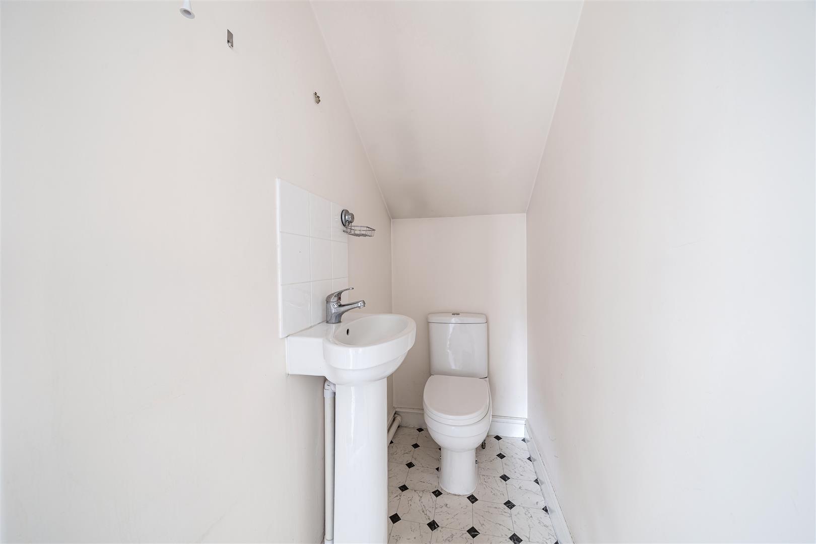A modern suite comprising of low level WC , wash hand basin and vinyl flooring and extractor fan.