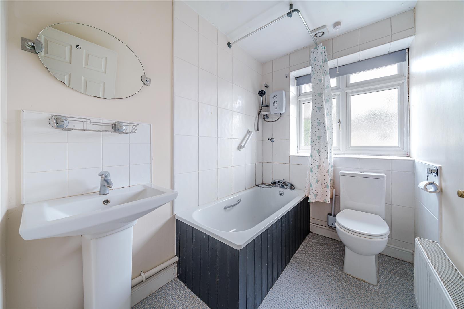 A modern bathroom comprising of panelled bath with wall mounted shower, low level WC, wash hand basin with mixer tap, tiled walls, extractor vinyl flooring and