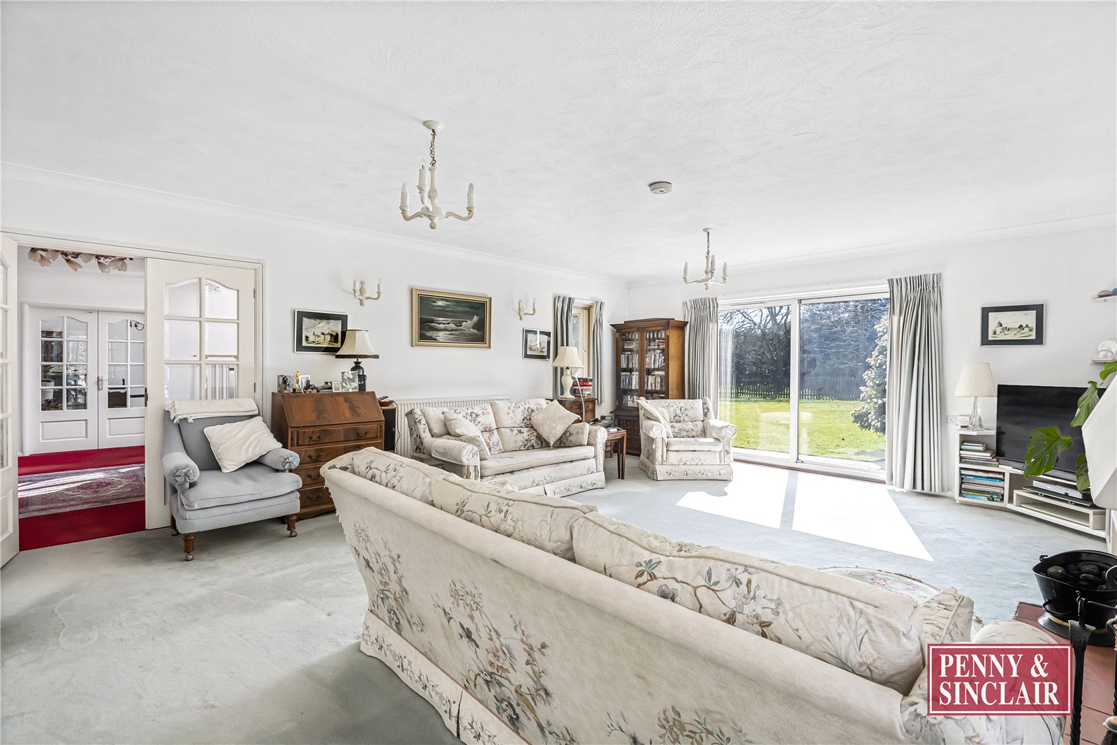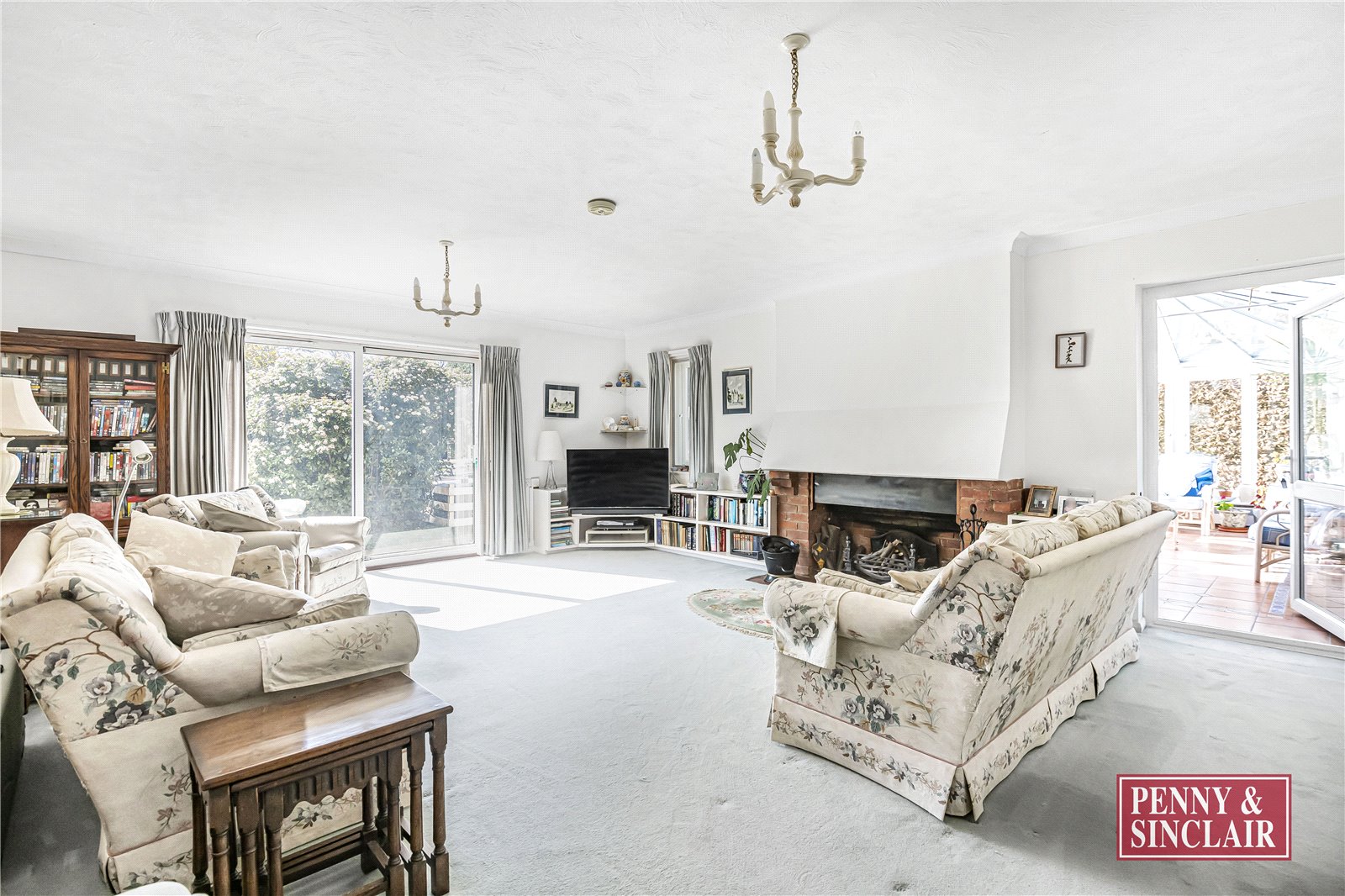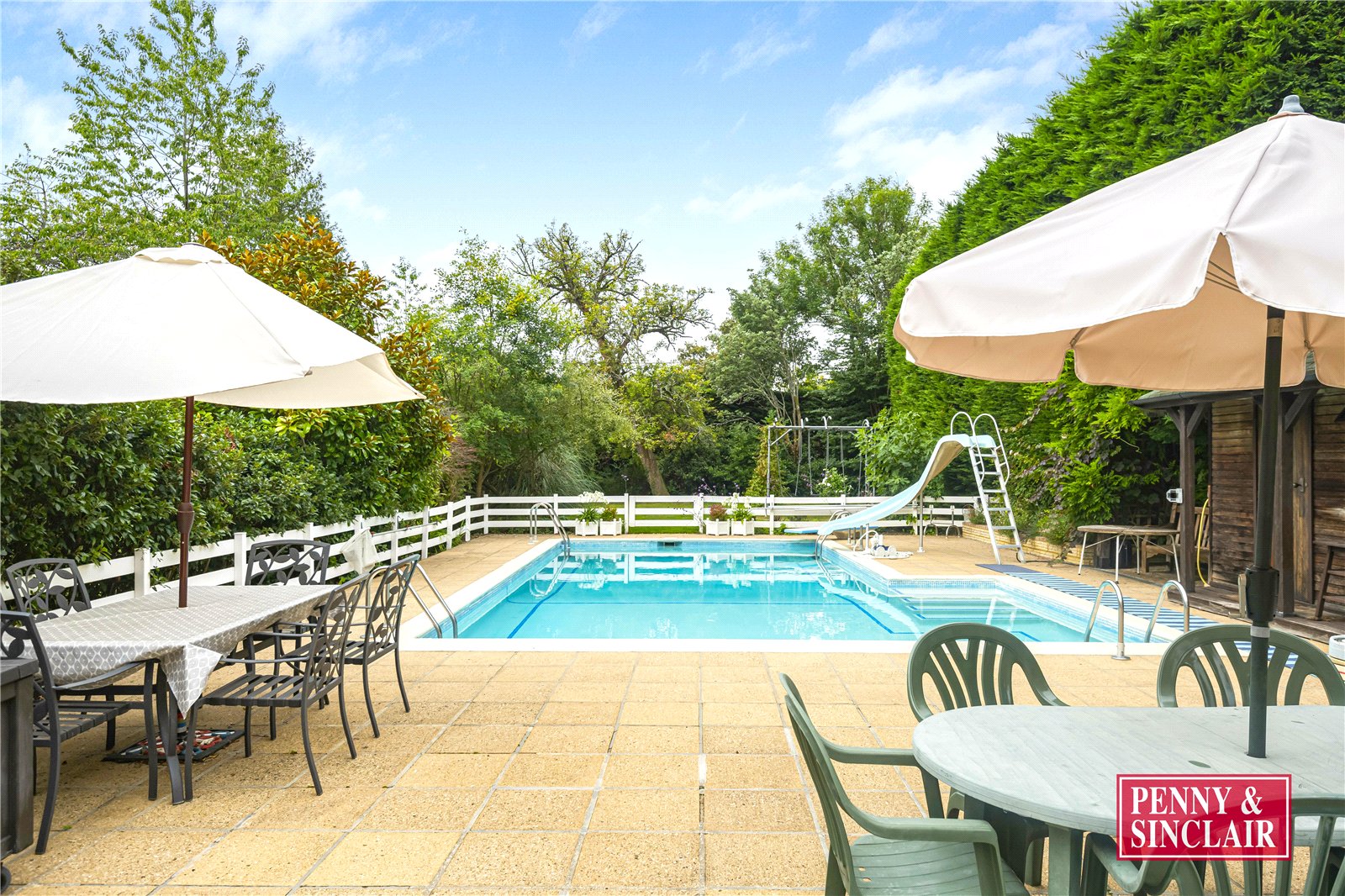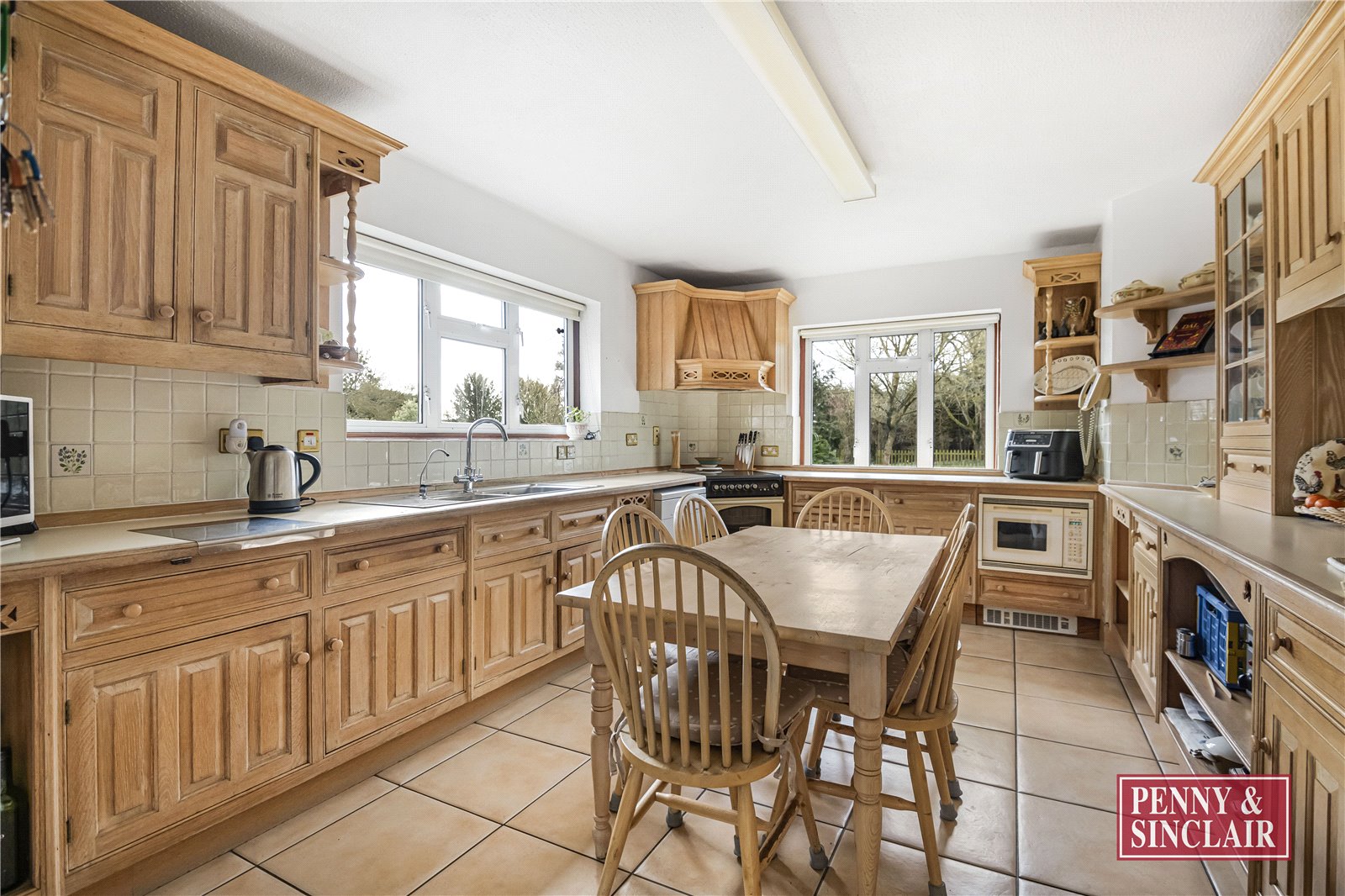 The home is accessed via a covered porch leading into a spacious entrance hall, with stairs rising to the first floor and access to all principal reception rooms. A charming 20ft sitting room with a feature open fireplace enjoys views across the gardens and leads through to a conservatory—an ideal spot to take in the outlook over the pool. The dining room sits adjacent to the kitchen, featuring a serving hatch and a window to the front, while the kitchen itself is fitted with an extensive range of storage units and has space for a dining table.