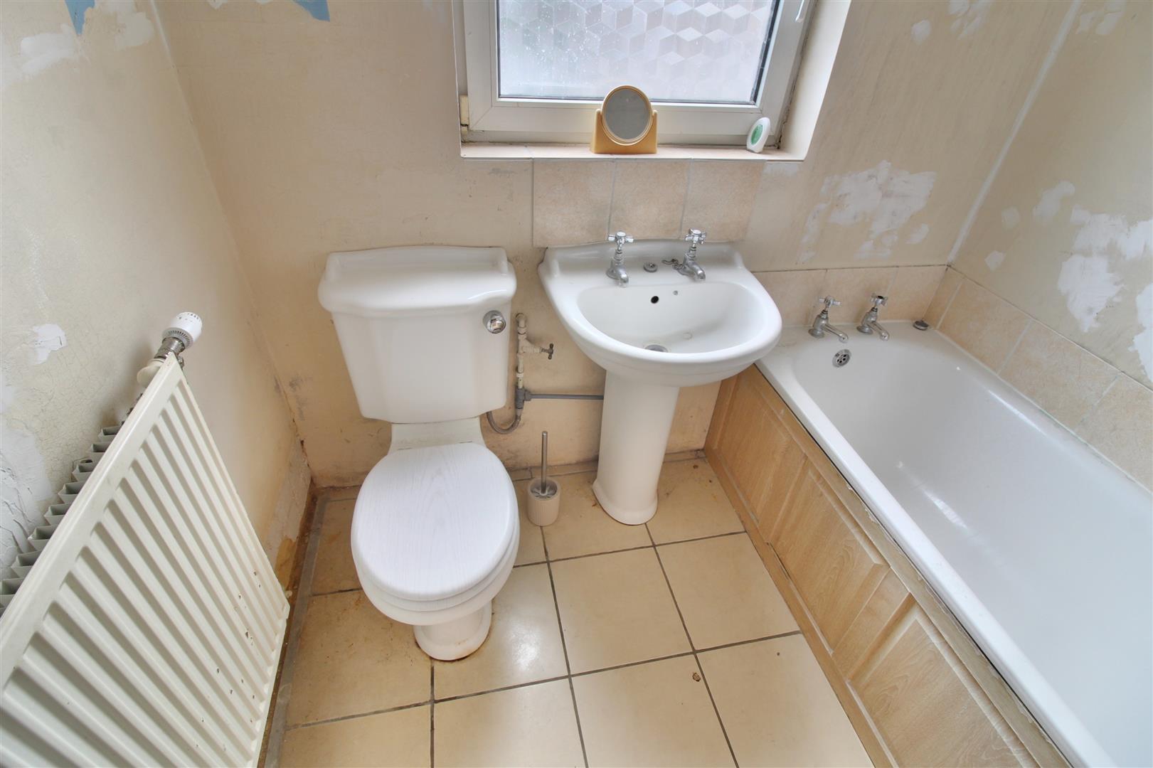 Compromising of a panelled bath, WC and wash hand basin. Tiled floor and a window to the rear.