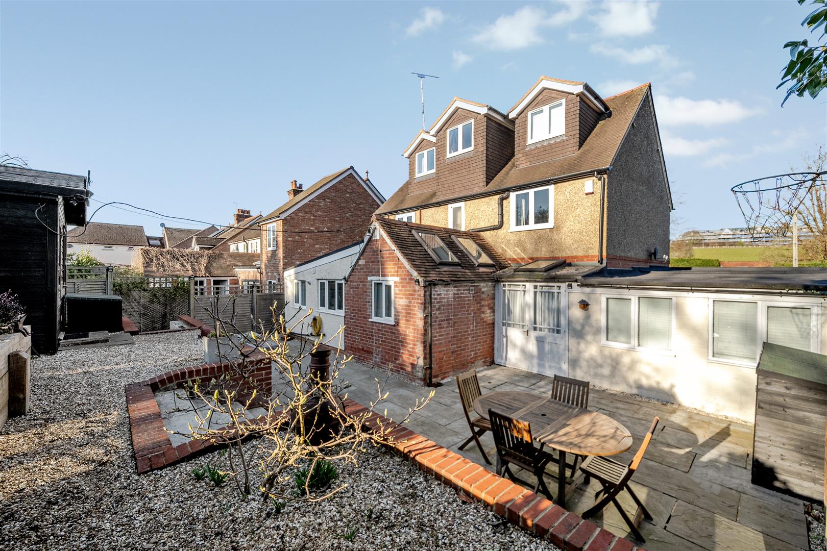 An extensive, well appointed, tiered garden with a very good sized patio, side access to the front of the property, bark floored play area, raised gravel patio and vegetable garden