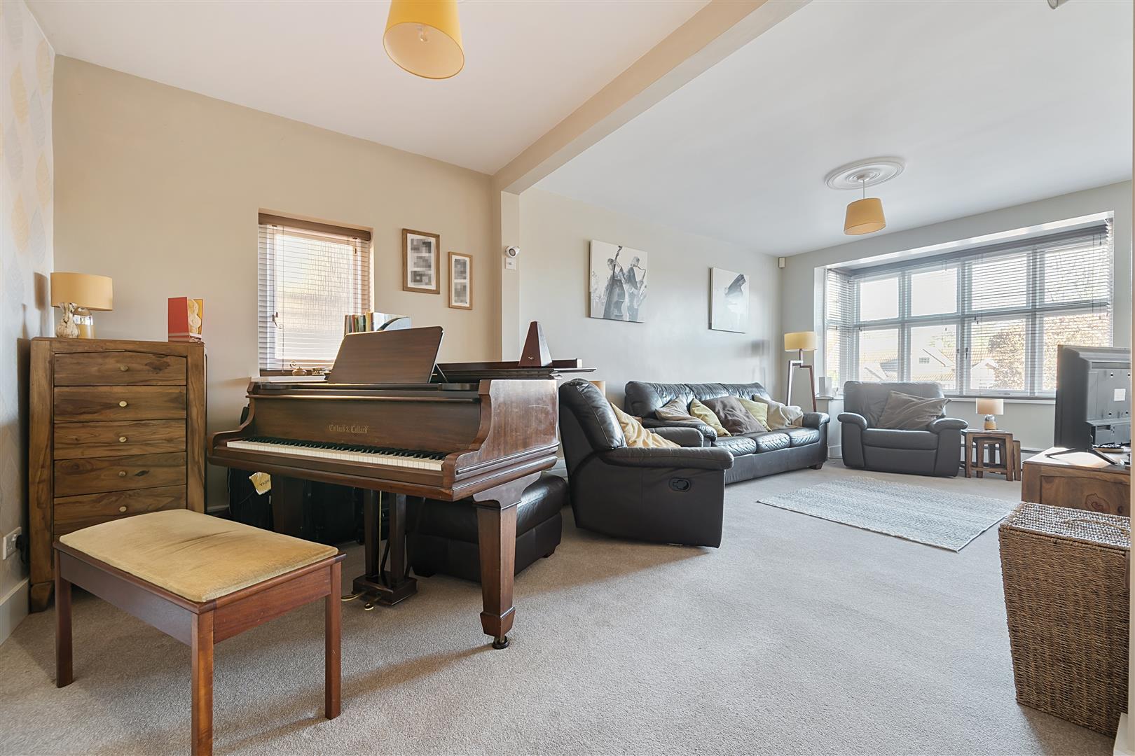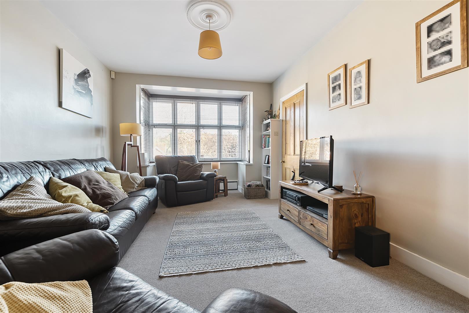 A very spacious, carpeted living room with a bay window overlooking the front of the property.
