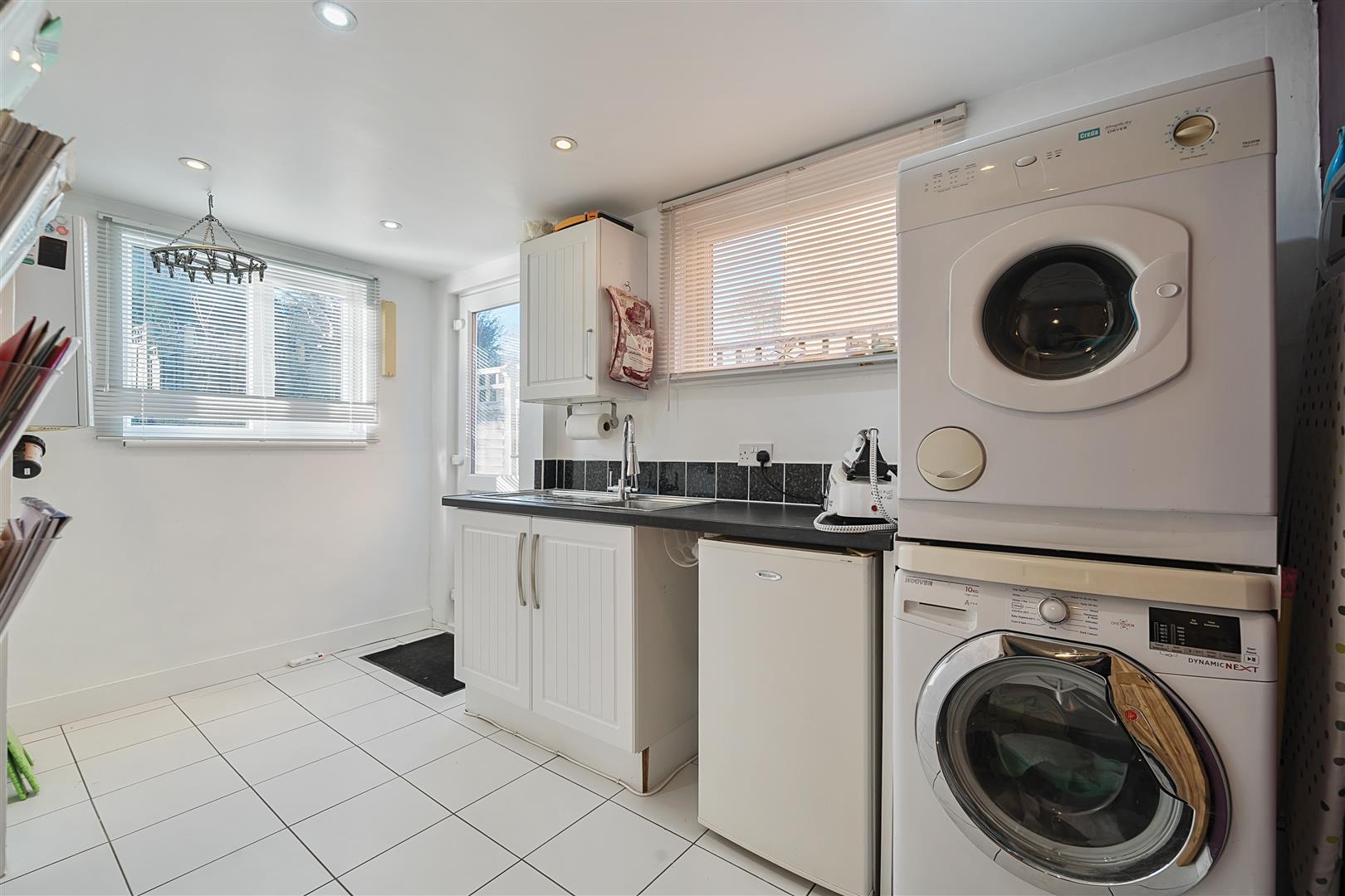 Tiled utility room with windows to the garden and the side of the property, sink and additional storage, space for washing machine and tumble drier along with doors to the garden and the WC.