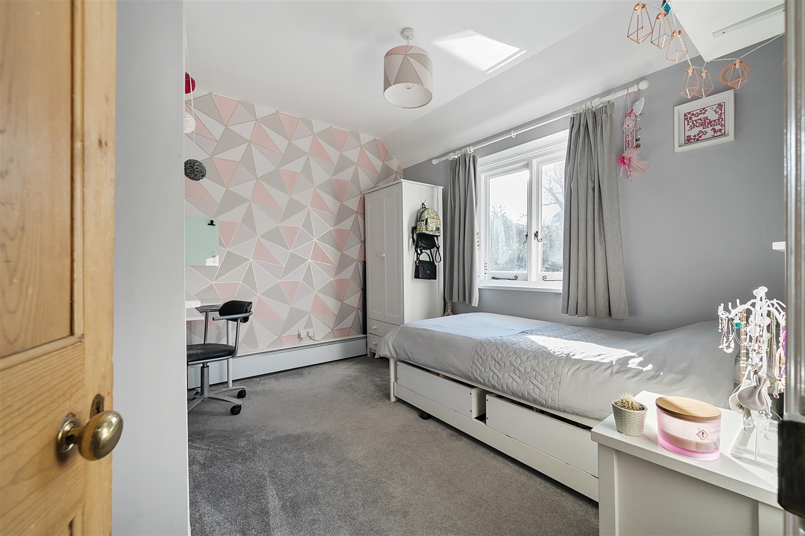 An extremely spacious, double bedroom suite with three Velux windows to the front of the property, a window overlooking the garden, three built in cupboards, one full length and one half length built in wardrobe and door to the en suite shower room.